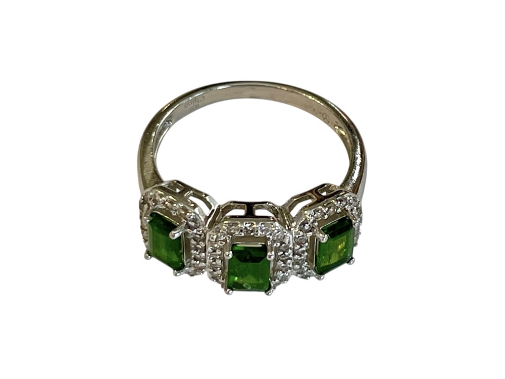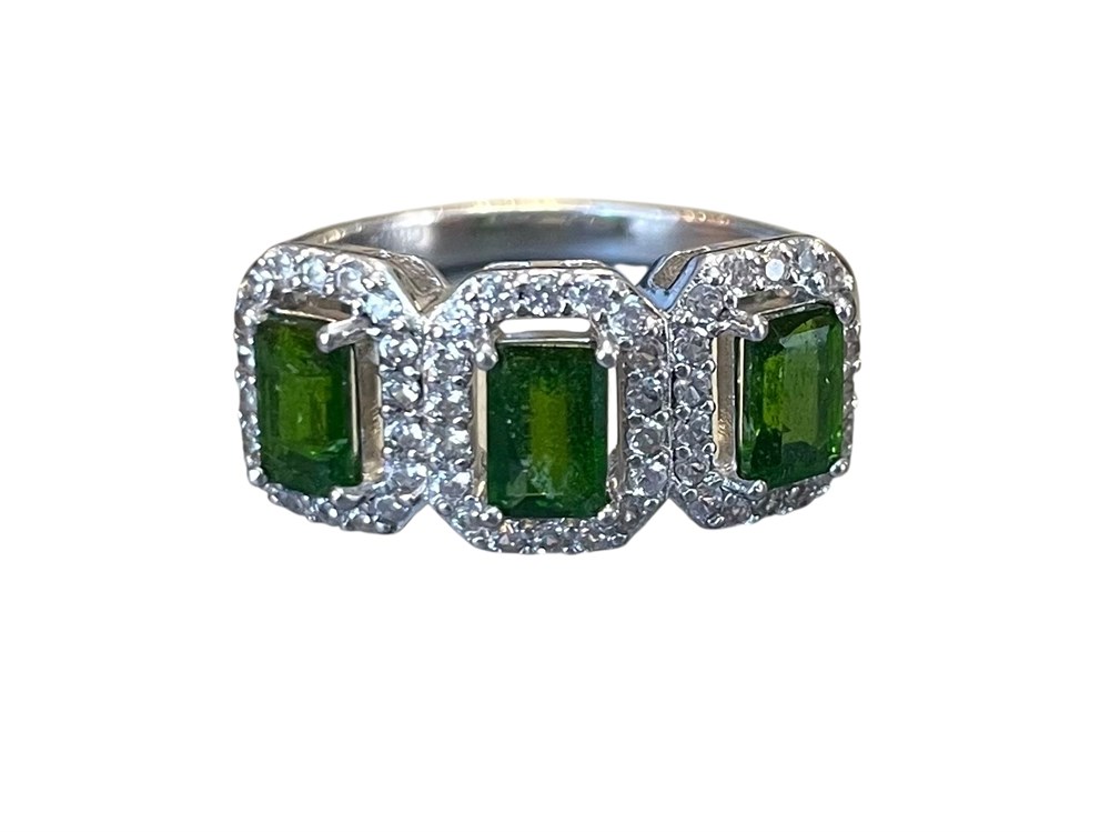 Featuring three green stones, with halos of white topaz.