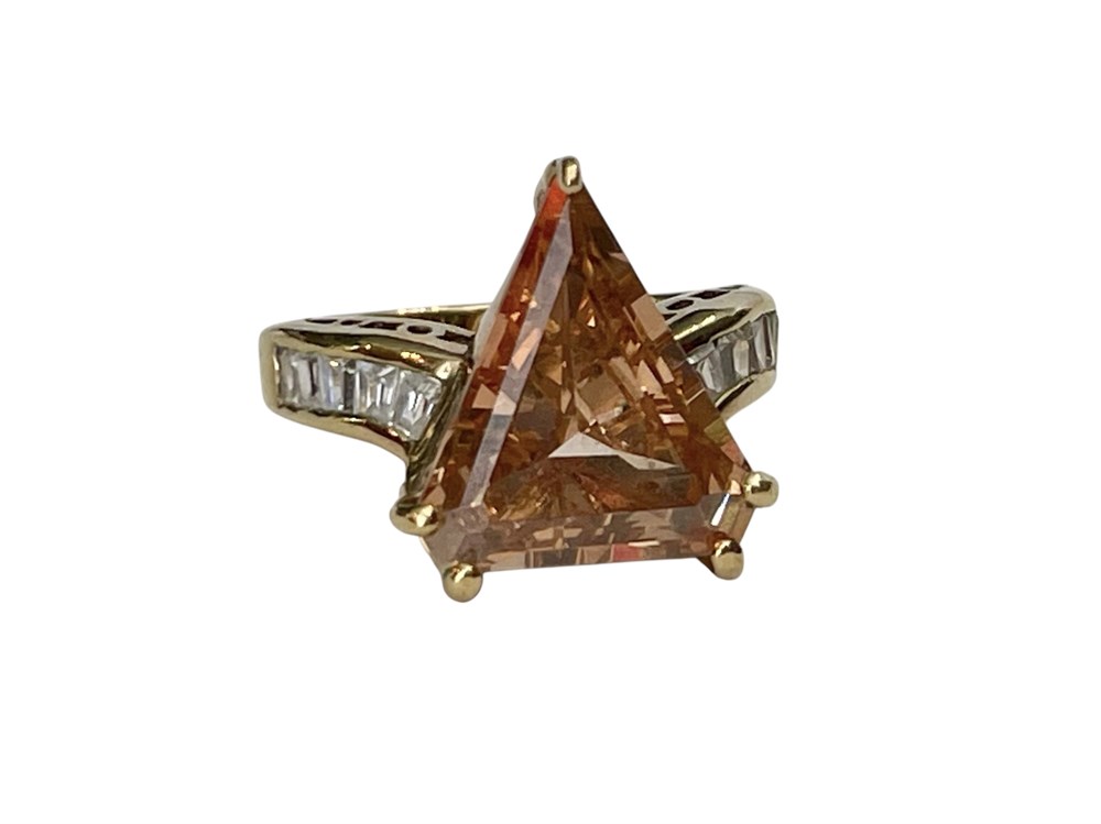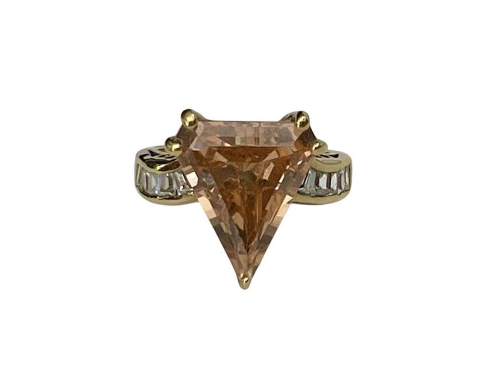 Lovely trillion cut stone, probably tourmaline according to gem tester.  Accented with white baguettes which are probably CZ.
