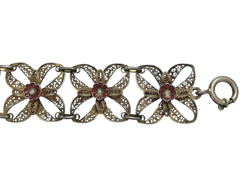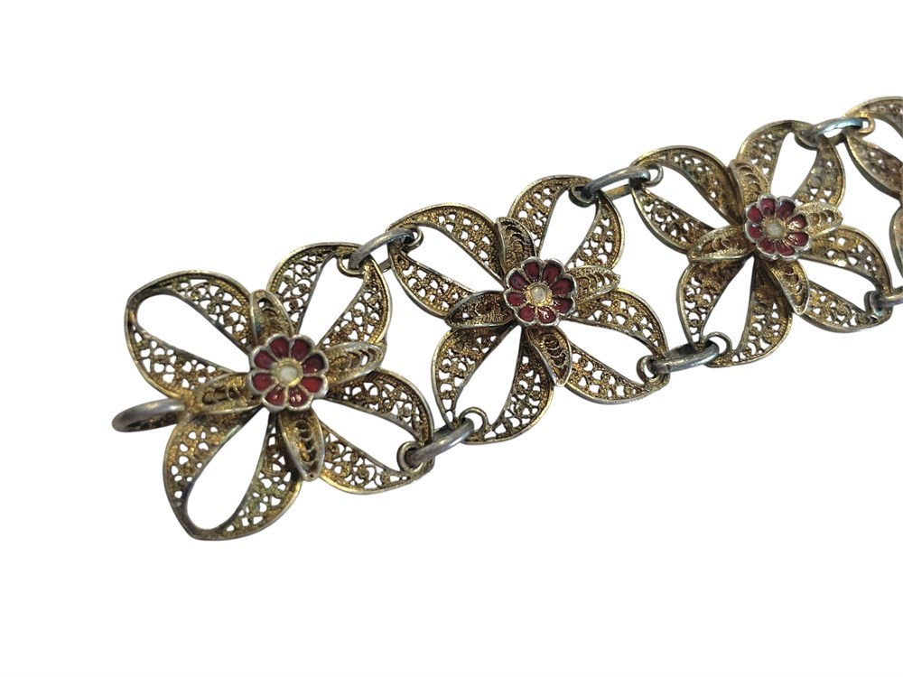 A 7.5" bracelet with intricate filigree, unmarked, gilt silver with enameled red flower accents.