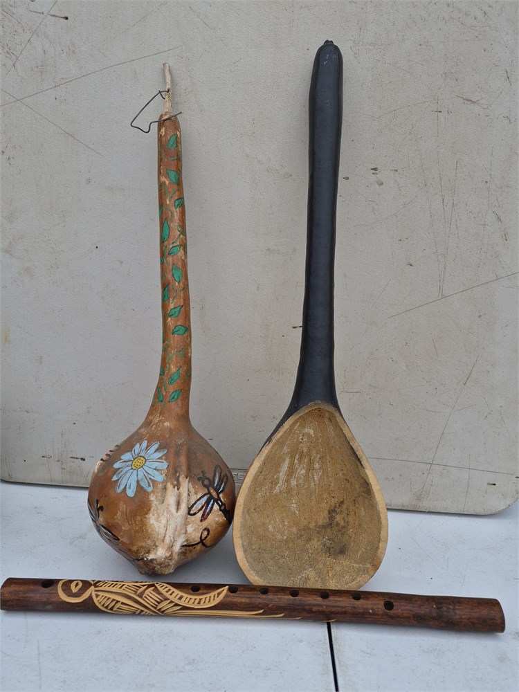 Lot of hand-painted gourds and a wood flute. One gourd has an elephant and is a spoon or Ladle type item the other has dragonflies and is a rattle.