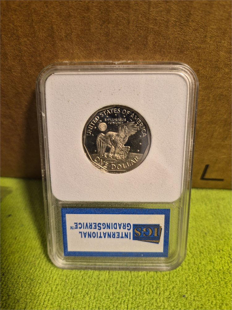1979 S Susan B Anthony $1 Coin. Coin is graded as PR70 CAM by IGS. Front of case is cracked.