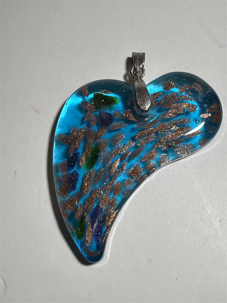Glass Heart Pendant Blue Teal And Copper Glitter Necklace The class 925 Sterling