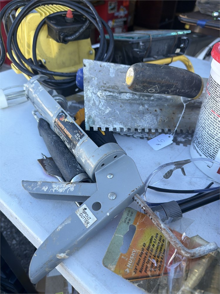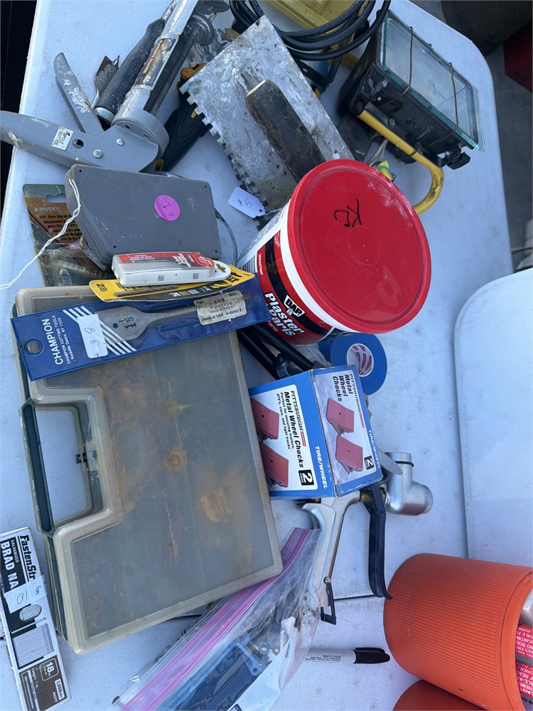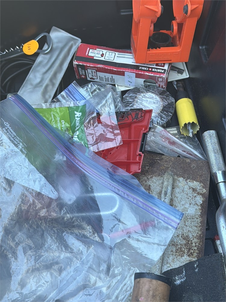 Huge lot of tools, miscellaneous pipe, threaders, padlocks, concrete planes, drywall planes, tile planes, assortment of electrical tools, including players, tips night, lights and lots more bucket not included