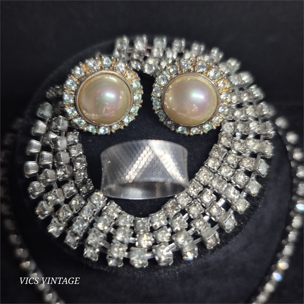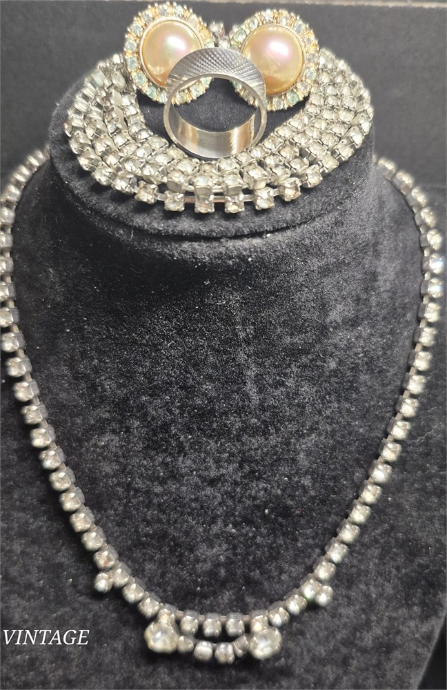 Vintage Rhinestone Necklace / Bracelet & Earrings / Sterling Ring [VC]