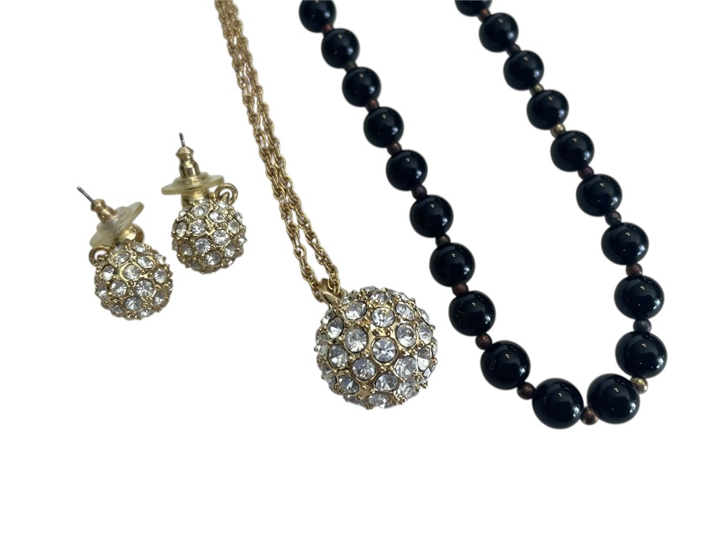 Including a goldtone set with matching earrings.  Also notice the nice black stone (onyx? cold to touch) beads with vintage silver(?) clasp.