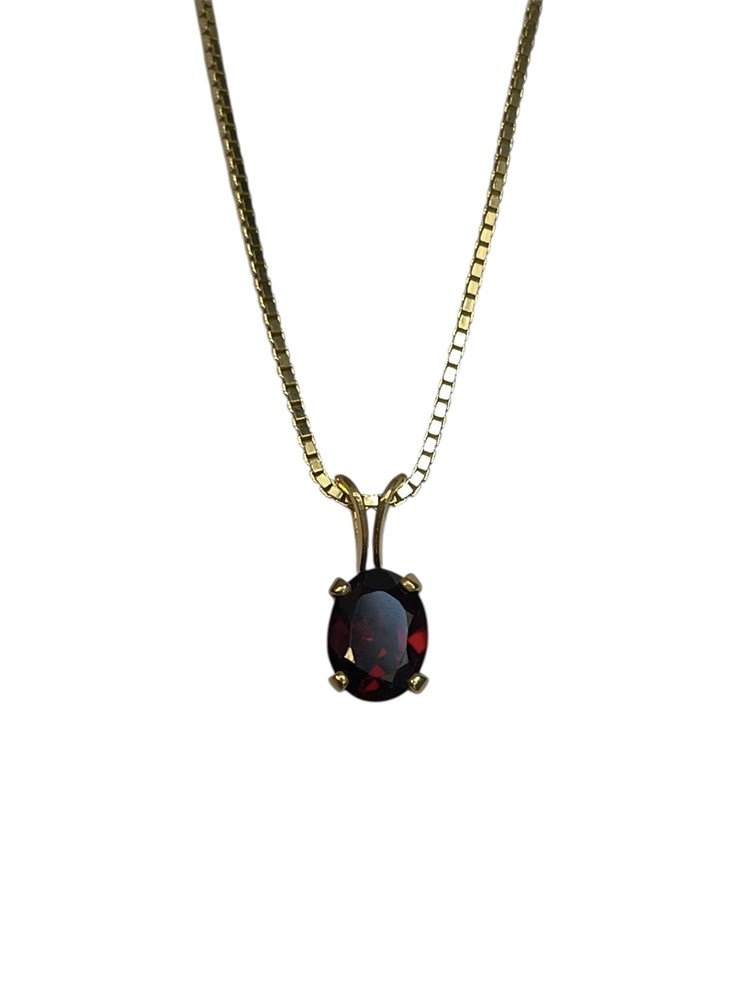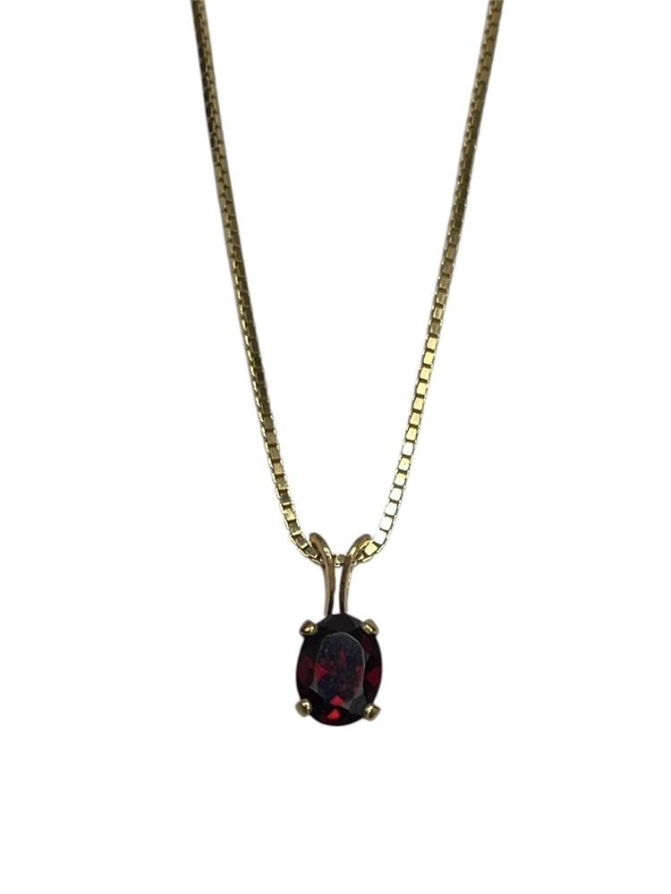 A oval garnet pendant in a 14K gold-filled setting (marked), pendant about 1/2" length.  The 18" chain is gold over sterling silver, marked 925.