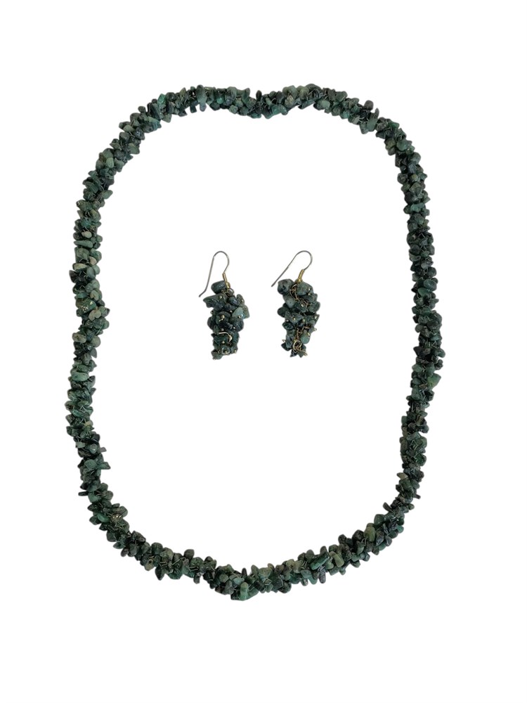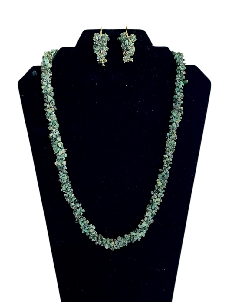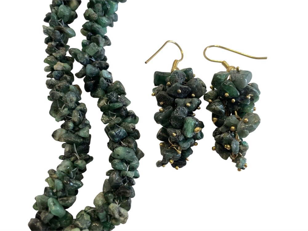 Probably raw emerald chips or similar green stones; necklace is about 25".  With coordinating earrings.