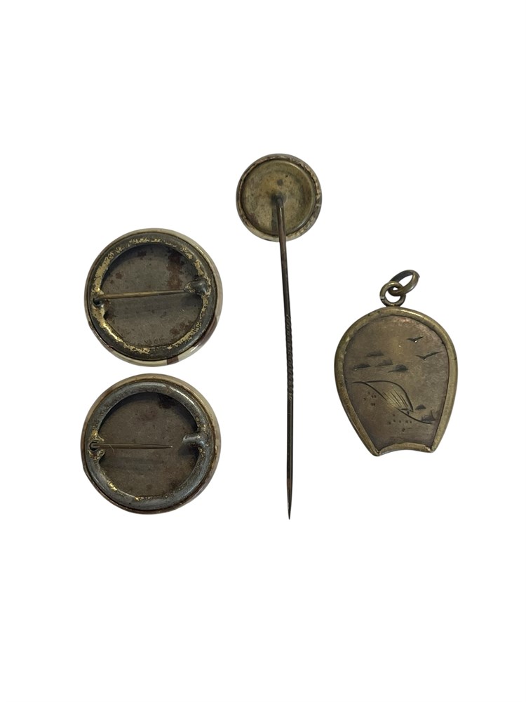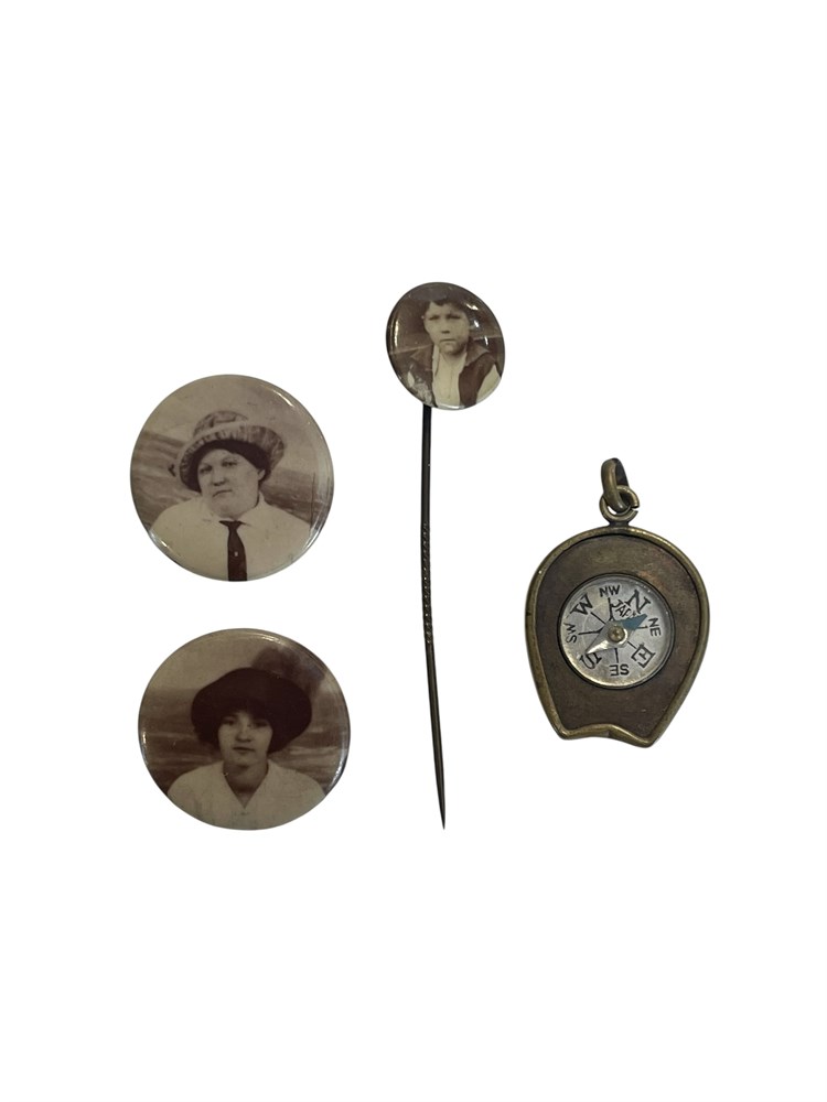 Brass Compass Charm/Fob and 3 Old Photo Pins