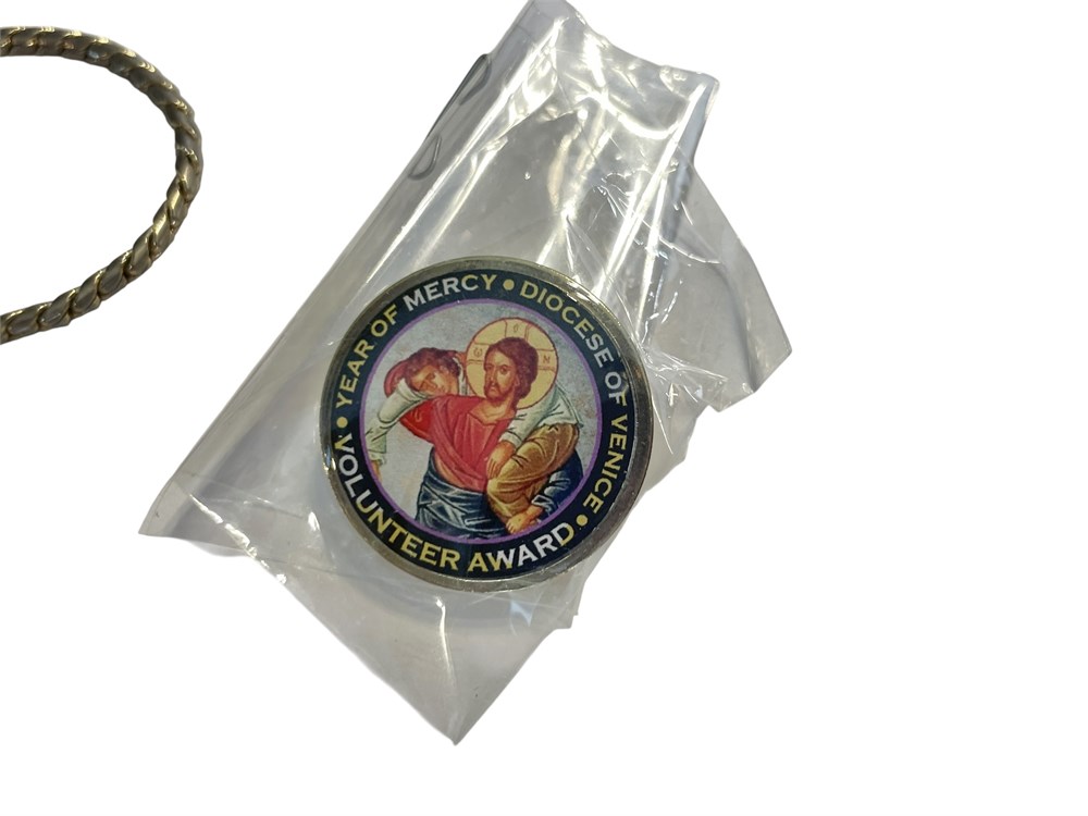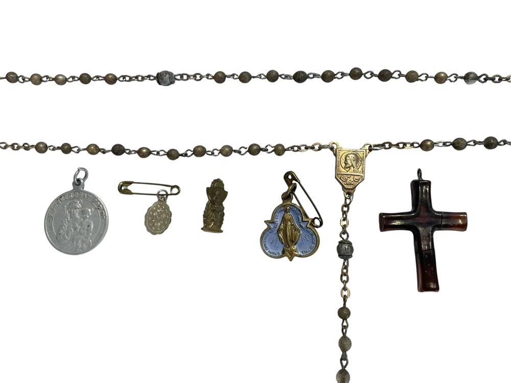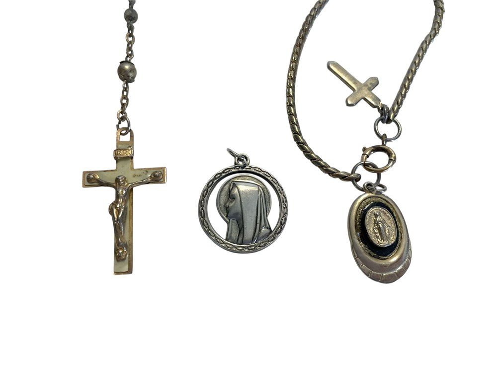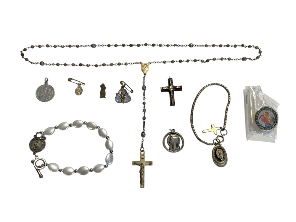 Catholic medallions, a modern St. Anthony bracelet, various items.