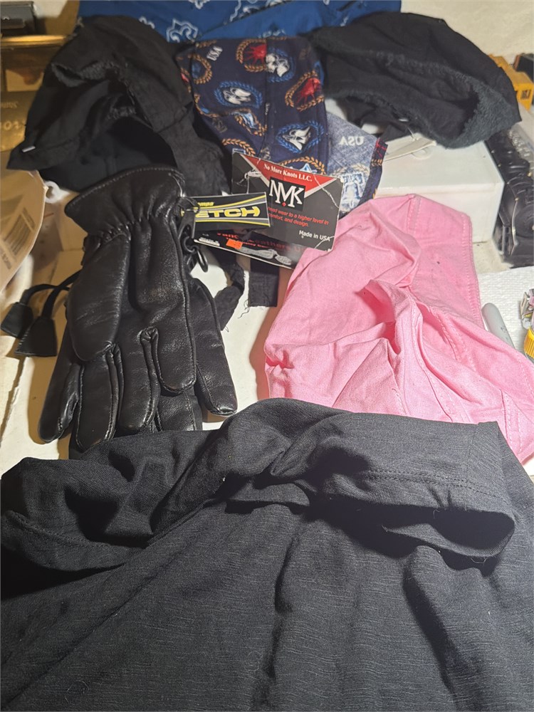 Women’s headgear, pink men’s black blues bonus leather pair of women’s gloves pair of women’s small capris in black it’s all new if you had to go buy this in a motorcycle shop, probably paying two to $300 for this