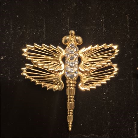 > Rhinestone DRAGON FLY, gold tone w/ stones along back, pin perfect