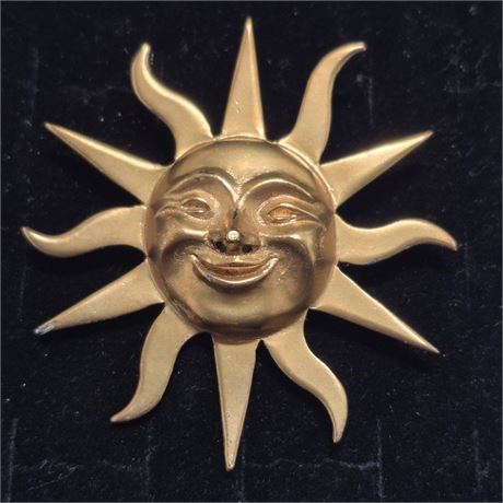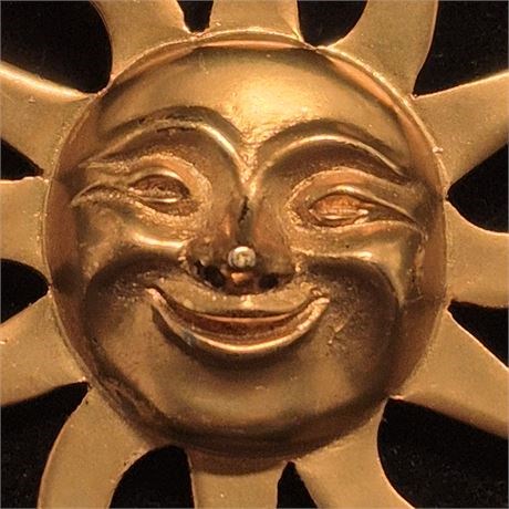 This item is a copy of an original Aztec-style sun from rare collectible items from the range entitled 'Alva Museum Replicas'. A fantastic gold-tone sun brooch, it shines in glorious gold and has a bright, friendly smile to match, creating a truly feel-good item of jewelry. Marked ALVA MUSEUM REPLICAS on reverse. Measure approximately 2.4-inch. The pin functions properly and is in good vintage condition