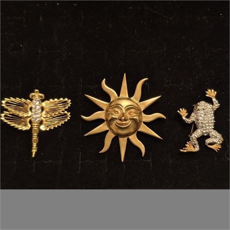 Alva Museum Replica Gold Tone Aztec-Style Sun Brooch, Signed & Animal Broochs [v