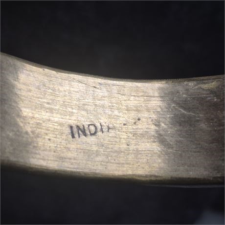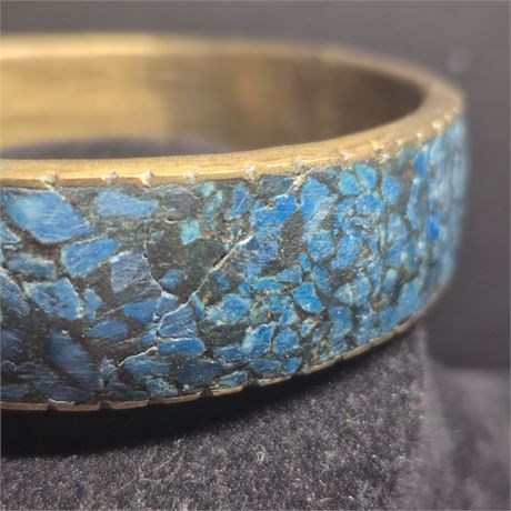 Up for sale is a vintage brass bangle bracelet featuring a crushed blue stone inlay. This bracelet measures 3/4" wide with a 3" outer diameter and an 8" inner circumference. The face is in good condition with very light wear, the brass on the inside has aged surface wear.