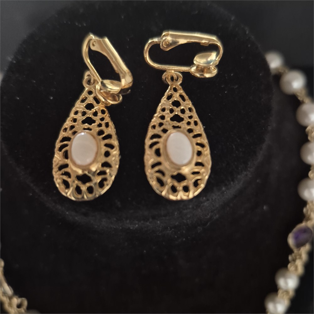 Vintage Pearl & Gold necklace with facet stones ~ earrings match [vc]