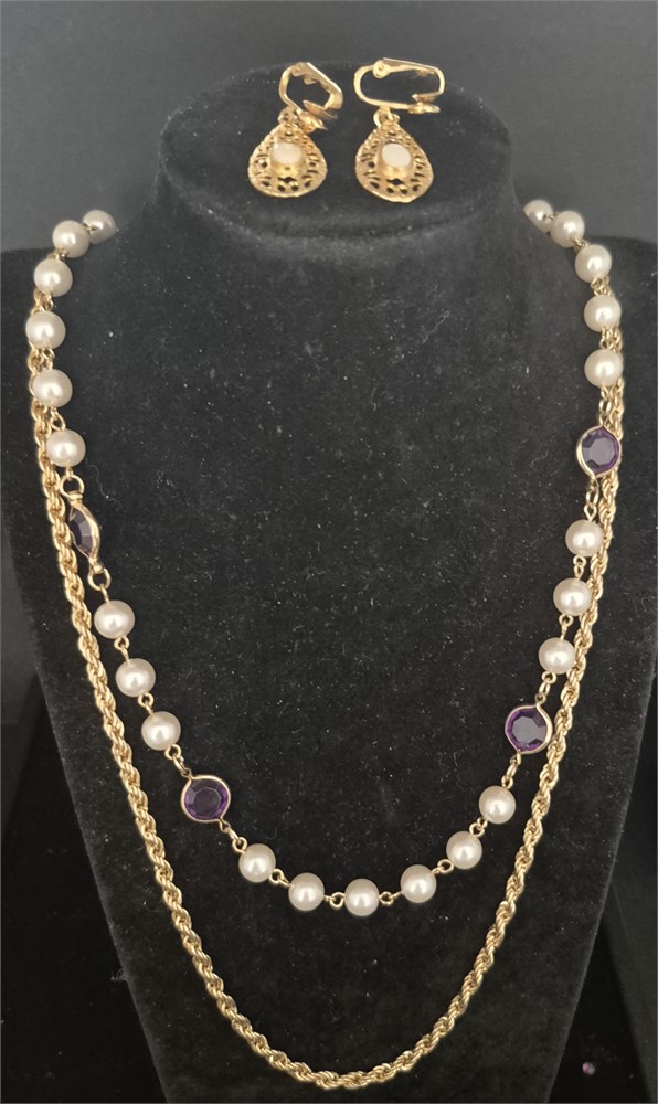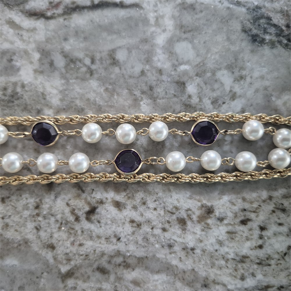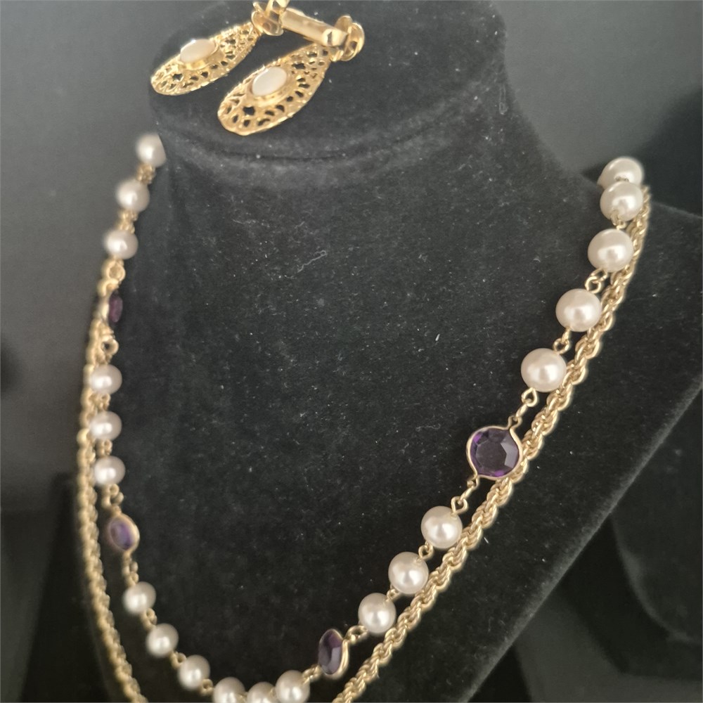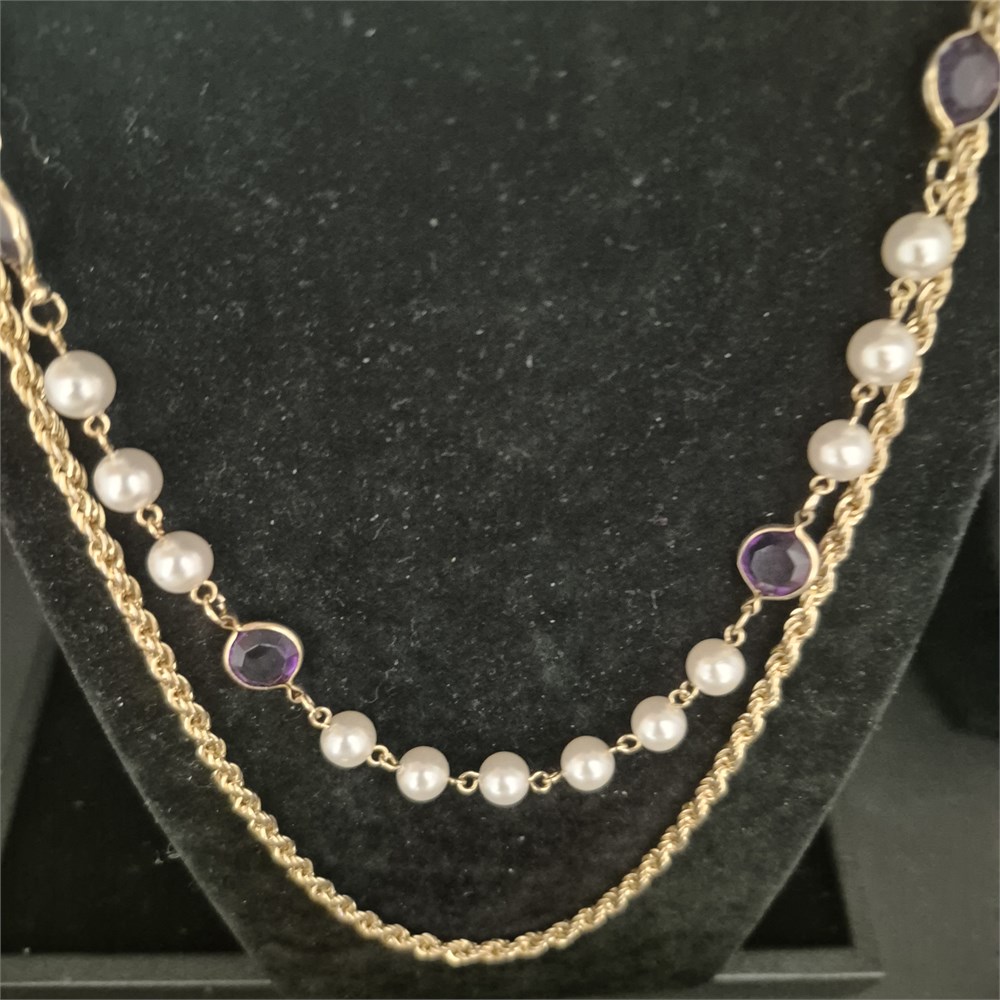 > necklace is double strand ;  pearl strand and gold chain link w/ facet purple stones