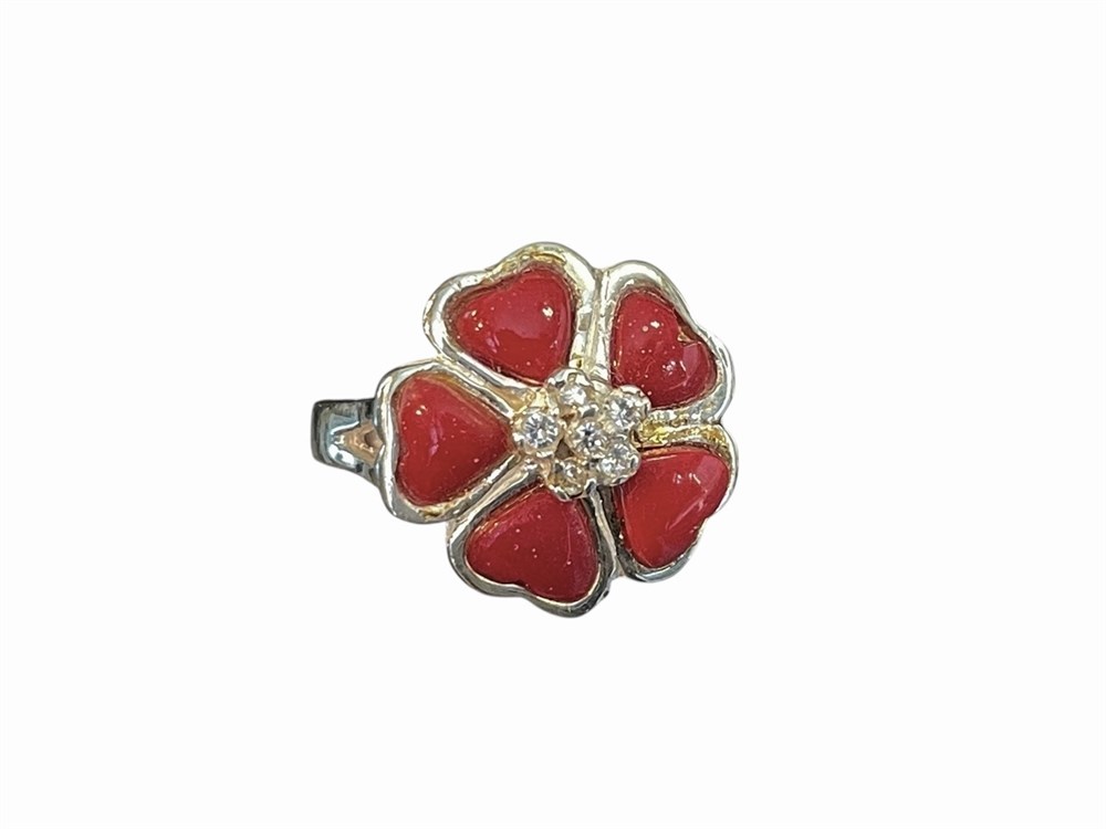 Heart-shaped coral petals create a bright red flower, with white stones in the center.  Marked 925.  Size 7 1/2