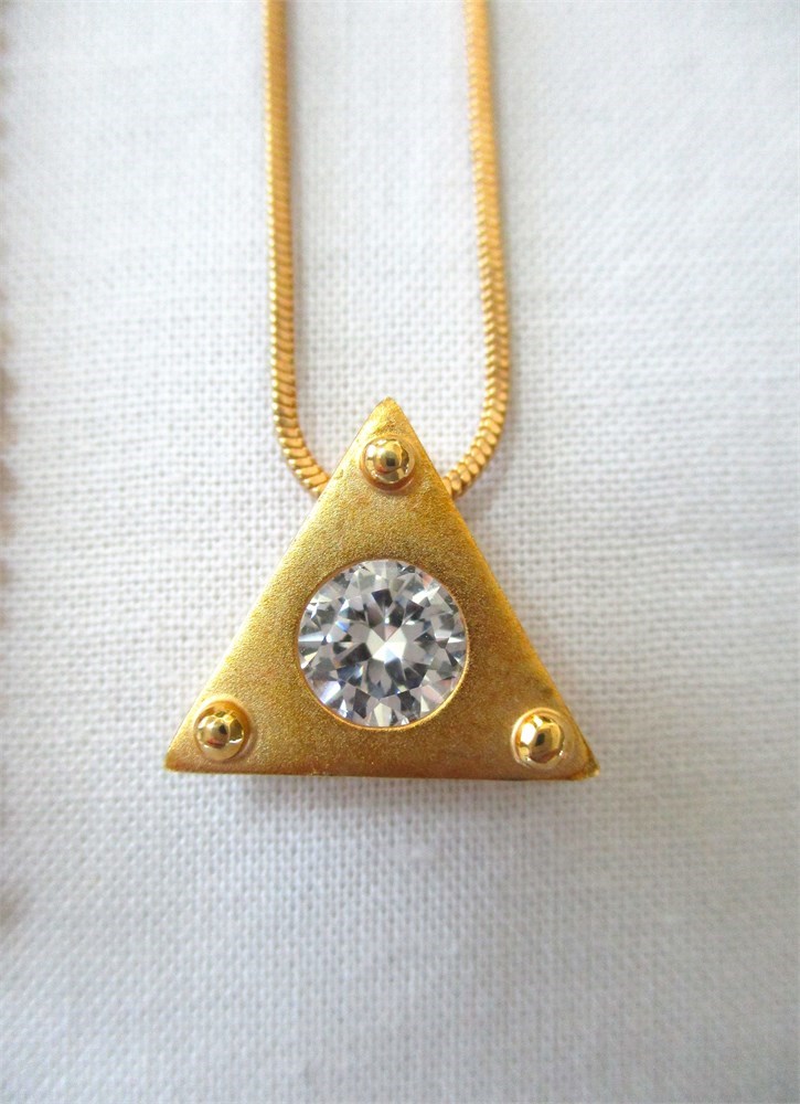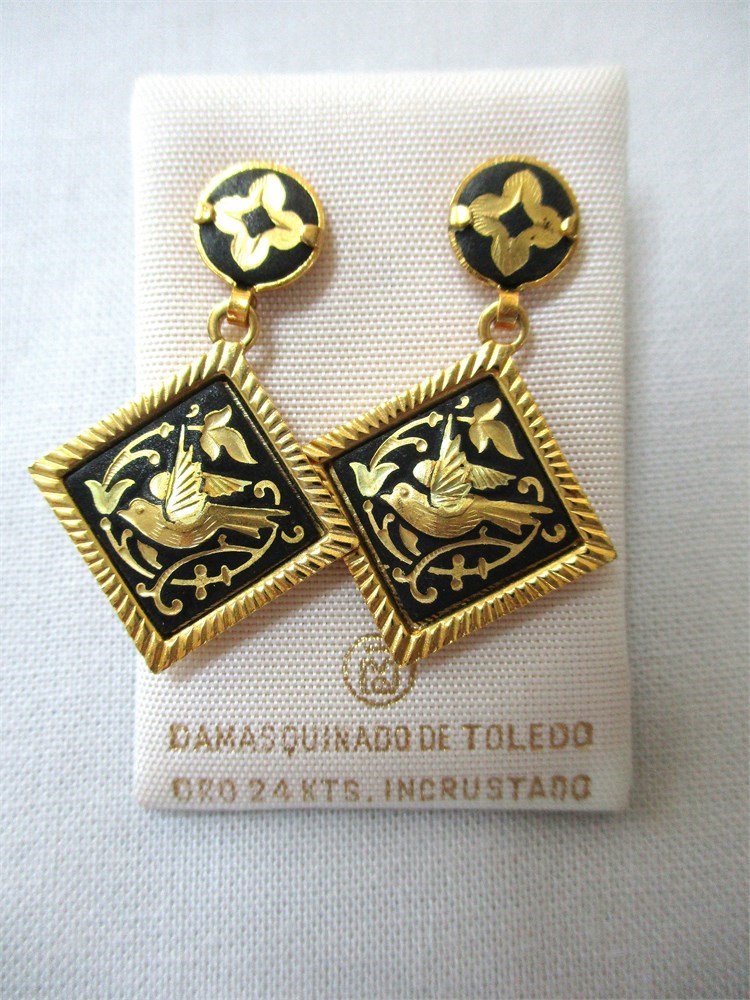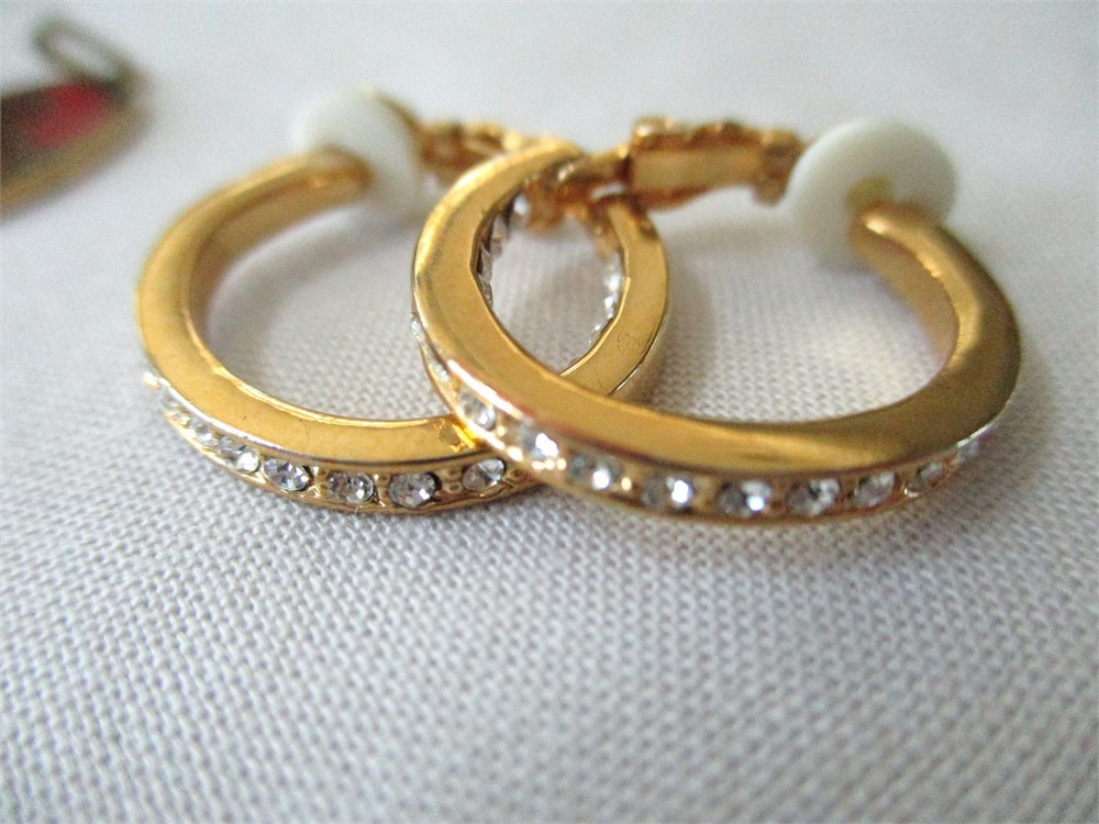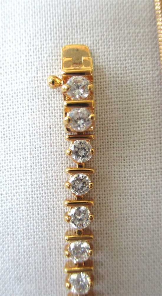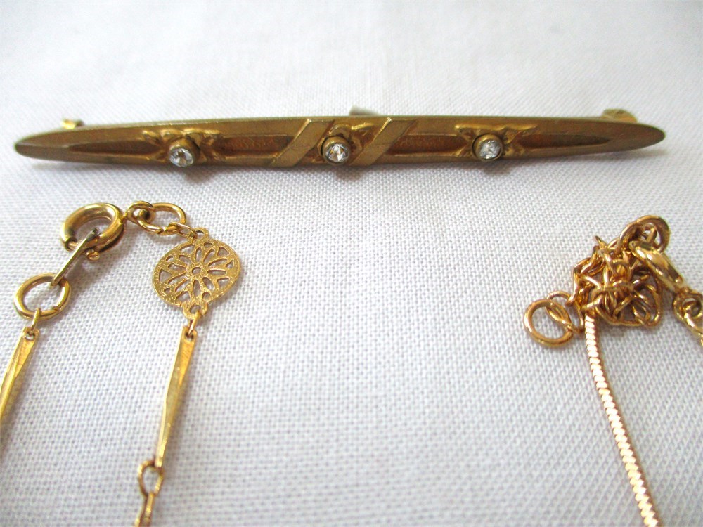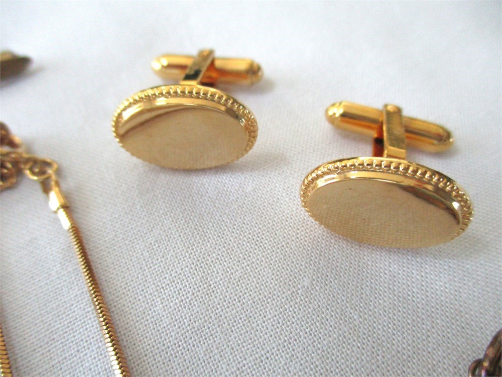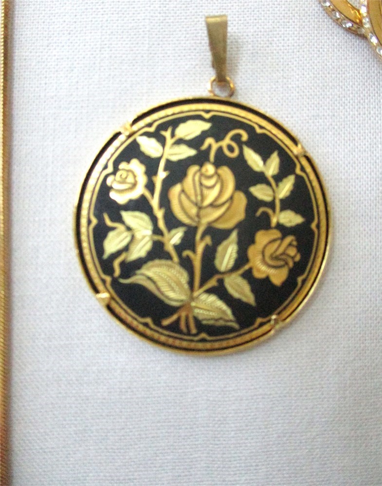 A wonderful vintage, antique and fashion jewelry lot consisting of a pair of beautiful vintage Damascene drop earrings, post back, a beautiful vintage Damascene round pendant, a Sterling oval hinged bangle bracelet, an antique, Victorian, gold filled and clear stone bar pin w/ C closure, a beautiful Sterling and CZ tennis bracelet w/ figure eight safety catch, 7.5", an antique, gold filled and blue enamel flower stick pin, a fashion gold-tone triangle shaped pendant with large CZ in the center with a 16" chain with an additional 2" extender, a gold-tone round filigree station necklace 15", a oval Jade pendant, an oval Cloisonne pendant, a pair of Christian Dior cuff links unisex, and a pair of gold-tone and CZ huggie hoop earrings with cushion back.  All of these pieces are in very fine condition, ready to wear or give.