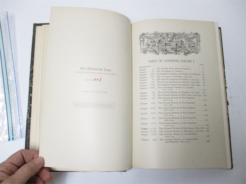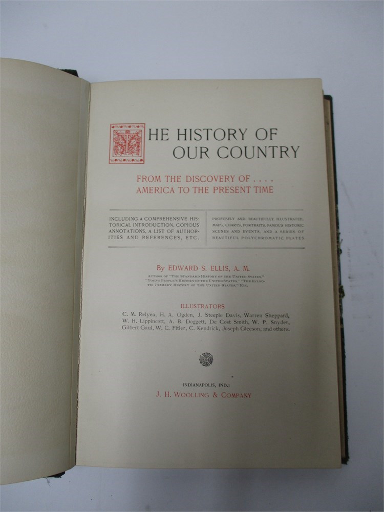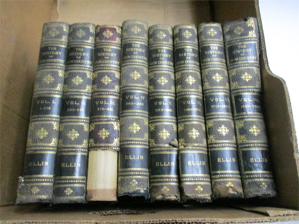 This is a 8 volume lot of the THE HISTORY OF OUR COUNTRY", By Ellis.  This is the "Edition de Luxe" limited to 500 copies of which these are 308, copyright 1899.  A wonderful compilation of history with maps charts, portraits, historic scenes and events and polychromatic plates.  These are old and show some wear but the interior pages are in remarkable condition.