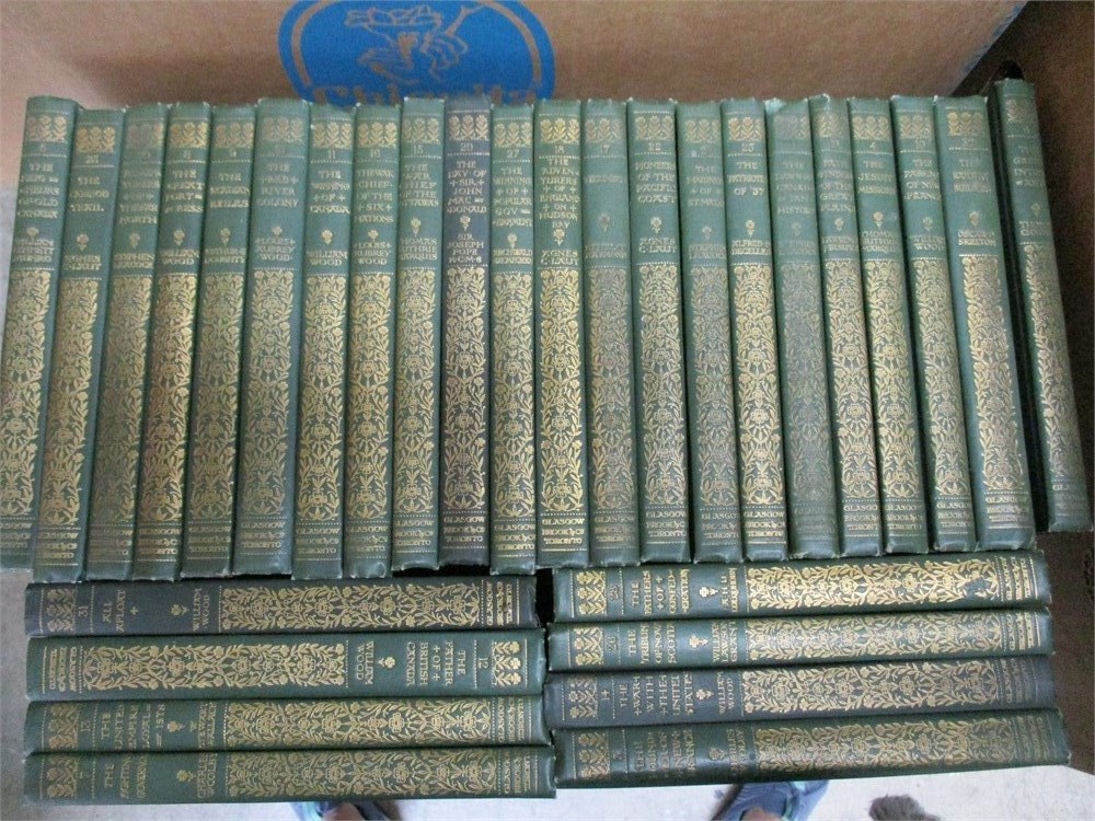This is a 30 volume lot out of 32 complete, of the" THE CHRONICLES OF CANADA", By William Wood.  This is a wonderful set of the history of Canada.  The books are in wonderful condition.  Green board covers with gold embossing.  Volumes 24 & 30 are missing.  These are small books measuring 7.25 x 4.75".
