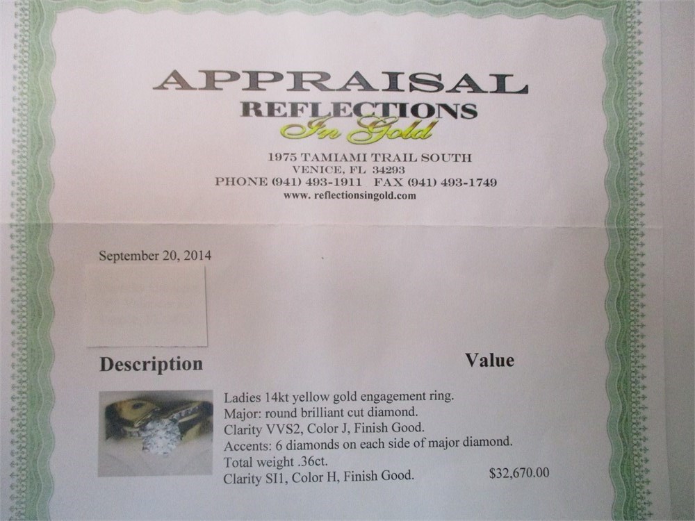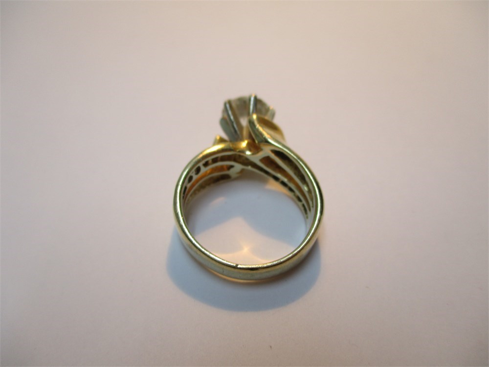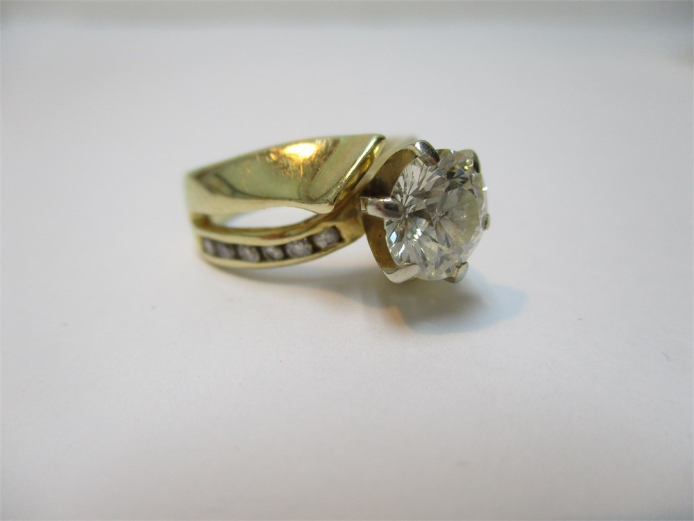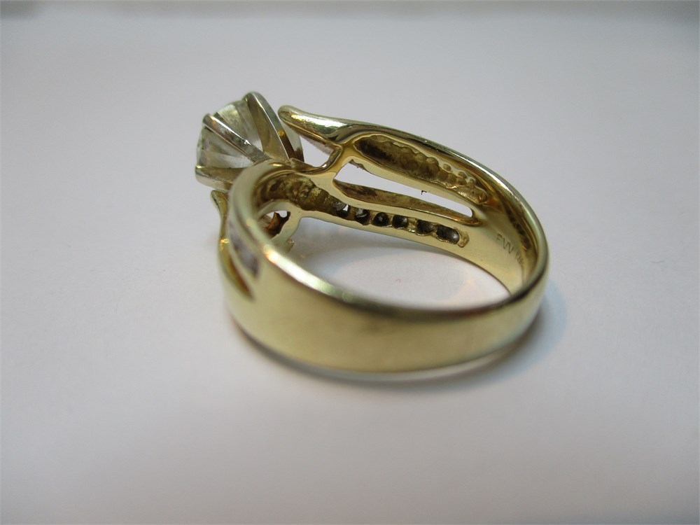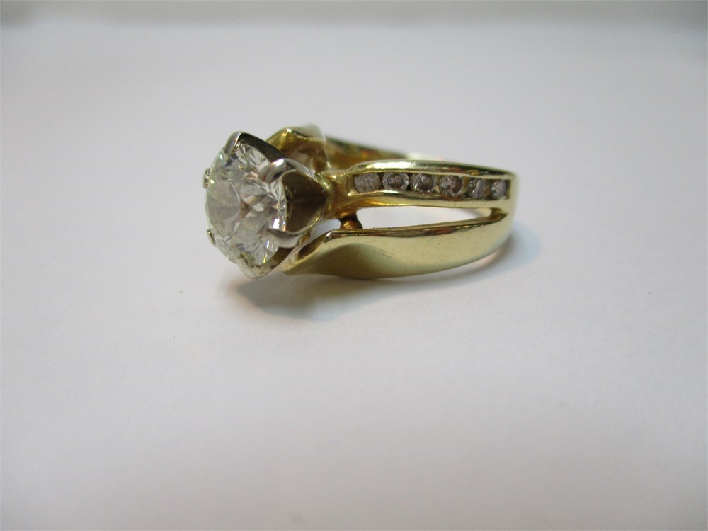 This is a Stunning 14K Yellow Gold &  Round Faceted Diamond Ring. Center stone is 1.2 Ct, & 1.36 total and  6.71g TW.  Size 4.5-5.  The band has a semi-split shank with Diamond accents on one part of the shank and on the other, solid gold that seems to wrap in a wave design.  The Large Faceted Diamond sits high on a 6 prong setting. It is very comfortable to wear with a silk fit on the inside of the band.  This is a Beautiful piece!  See Appraisal from Reflections in Gold, Venice, FL.