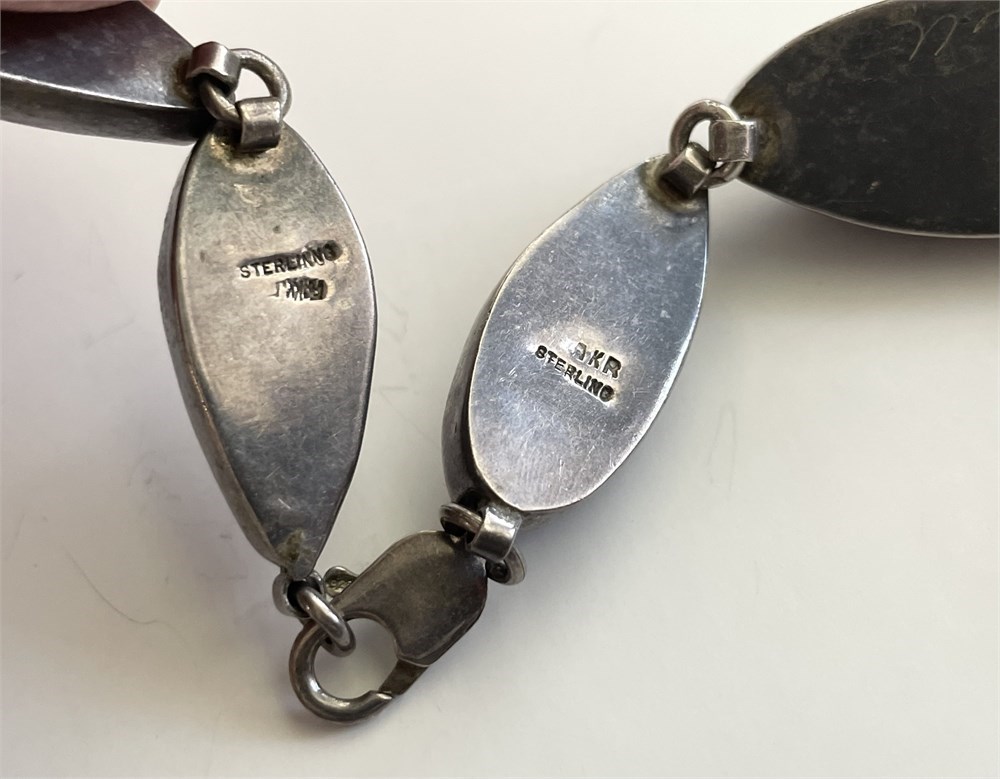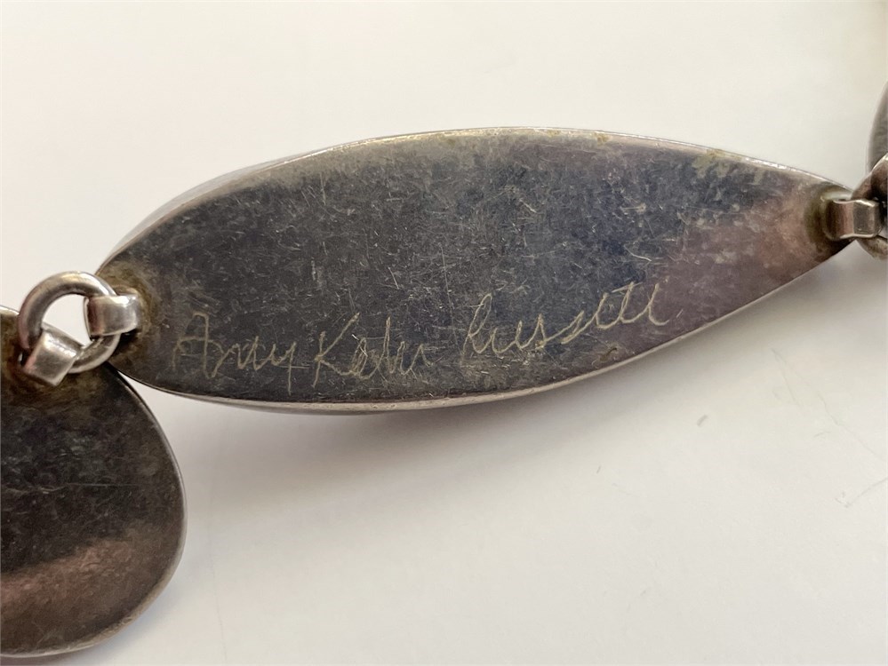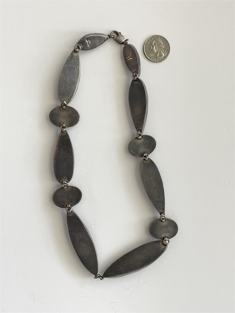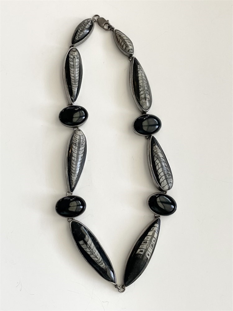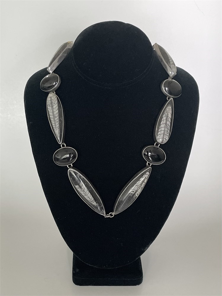 A FABULOUS designer statement necklace, substantial and heavy, made of polished orthoceras fossils and black onyx.  Signed Amy Kahn Russell, and stamped AKR / 925, for sterling silver.   The pictures do not do this piece justice and is much more beautiful in person! There is alot of Sterling here !