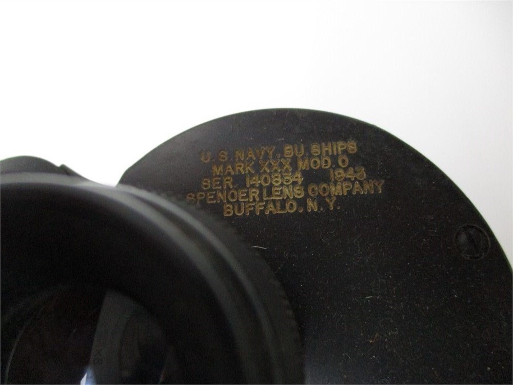 A pair of Vintage, 1943, US NAVY, BU. SHIPS, MARK XXX, MOD.0, 7x50 Spencer Lens Co. No case. Nice pair with normal age related wear.