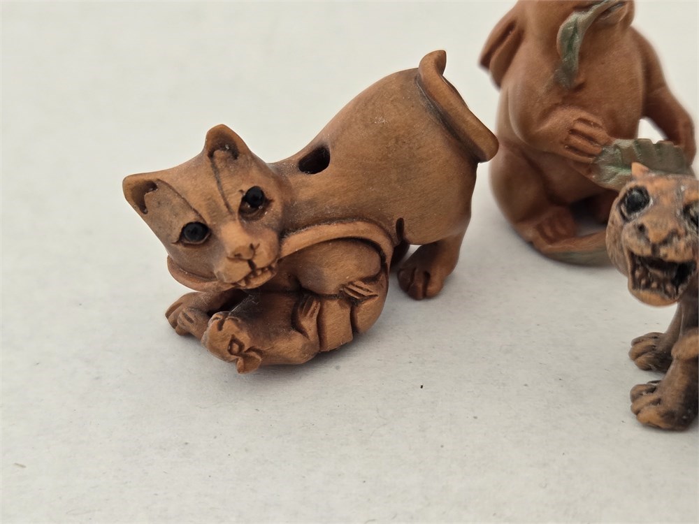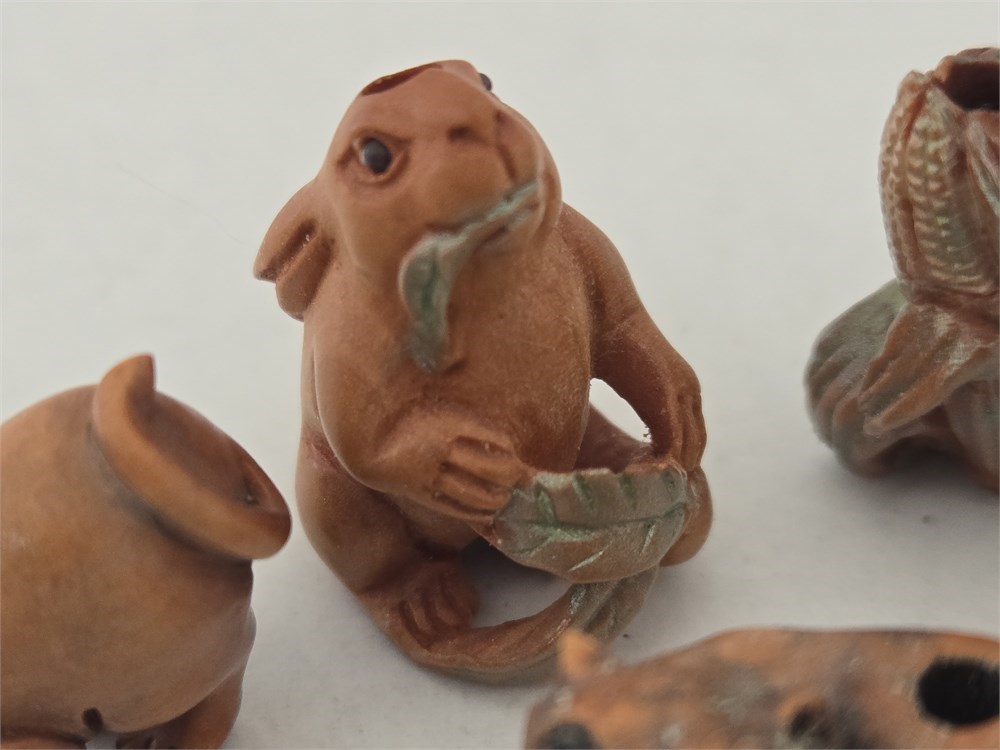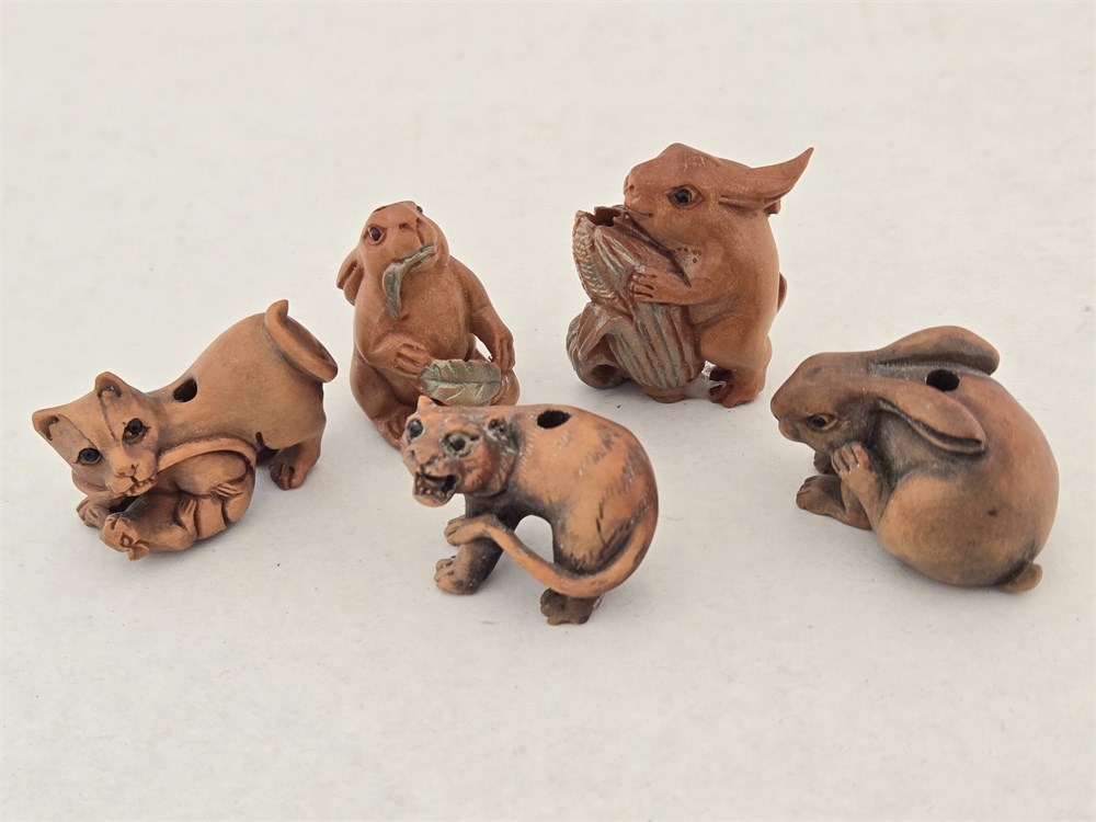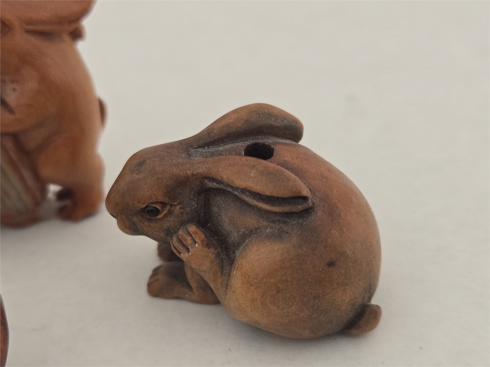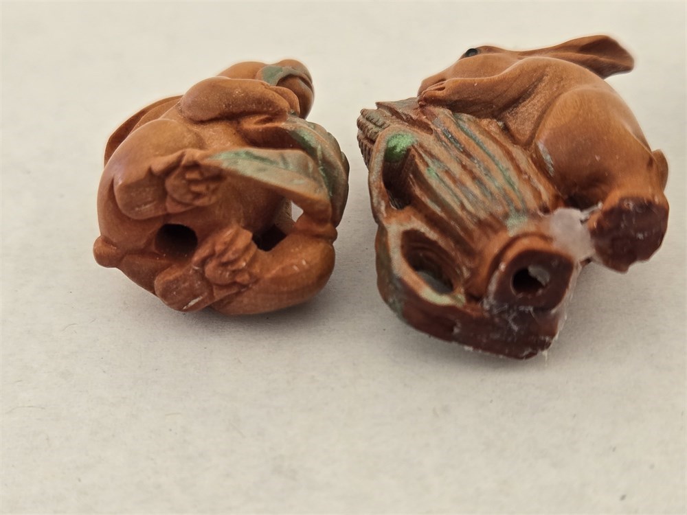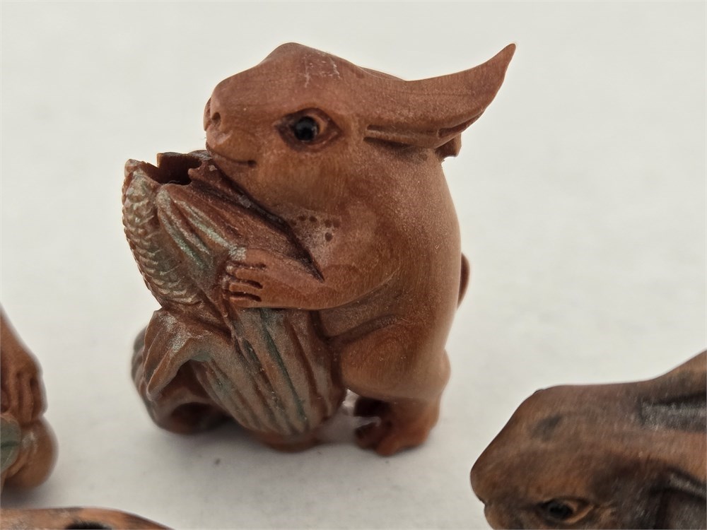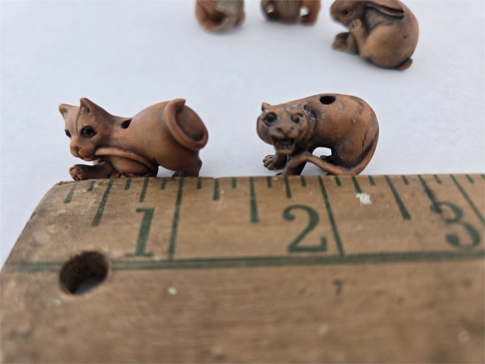 Hand-carved ojime bead lot Boxwood Rabbit,Cat,Tiger,Some Signed