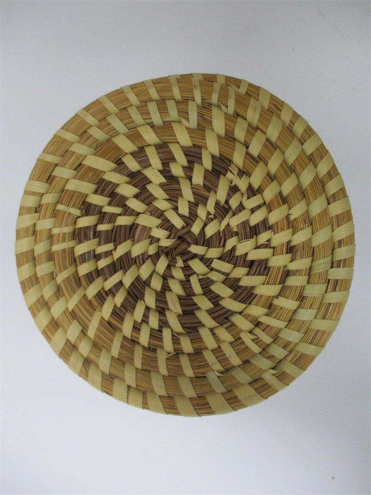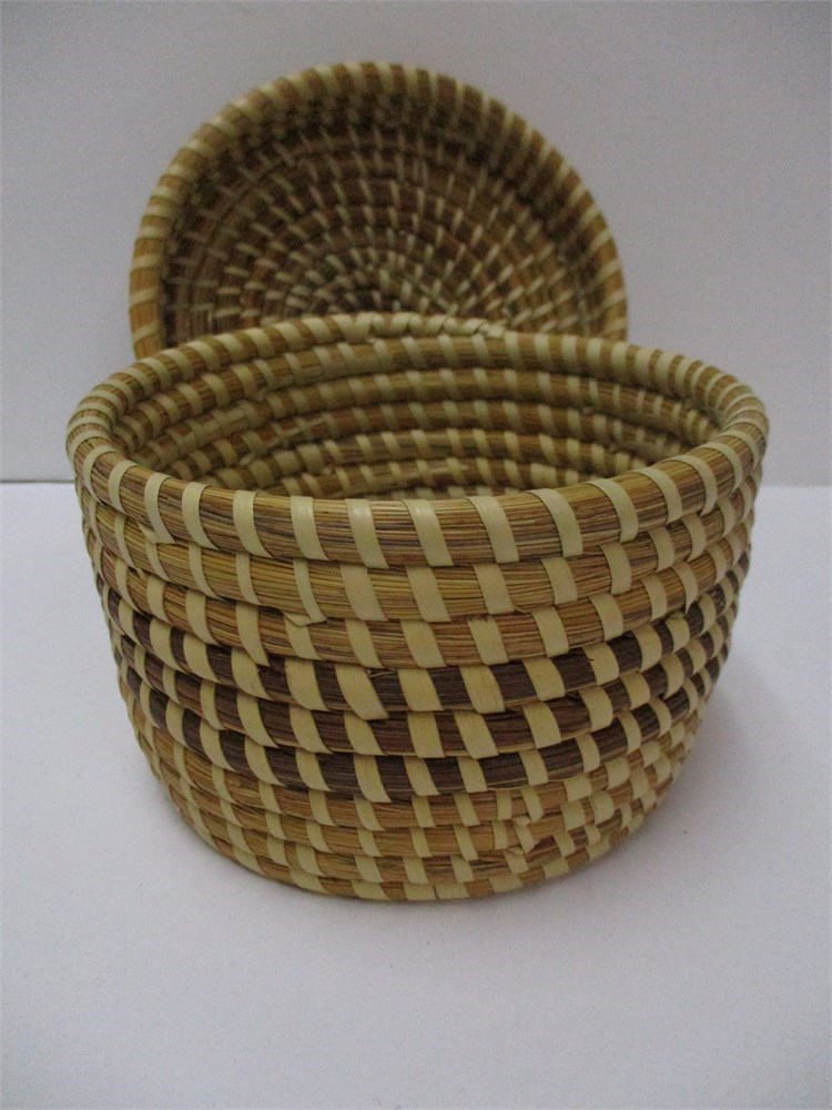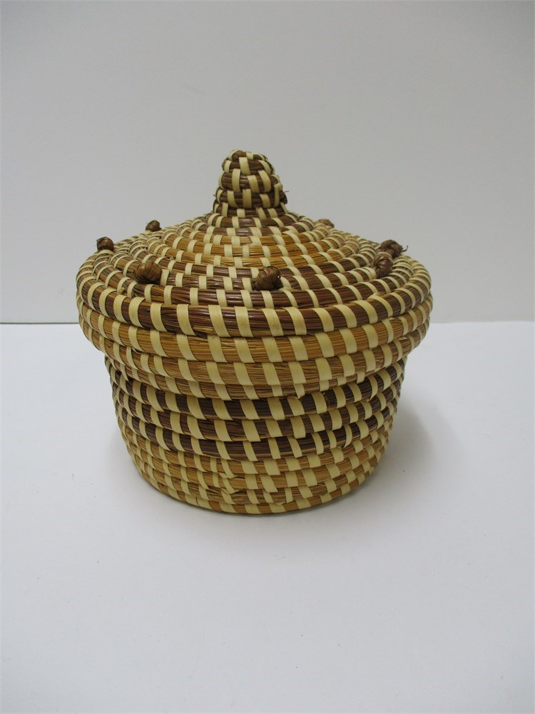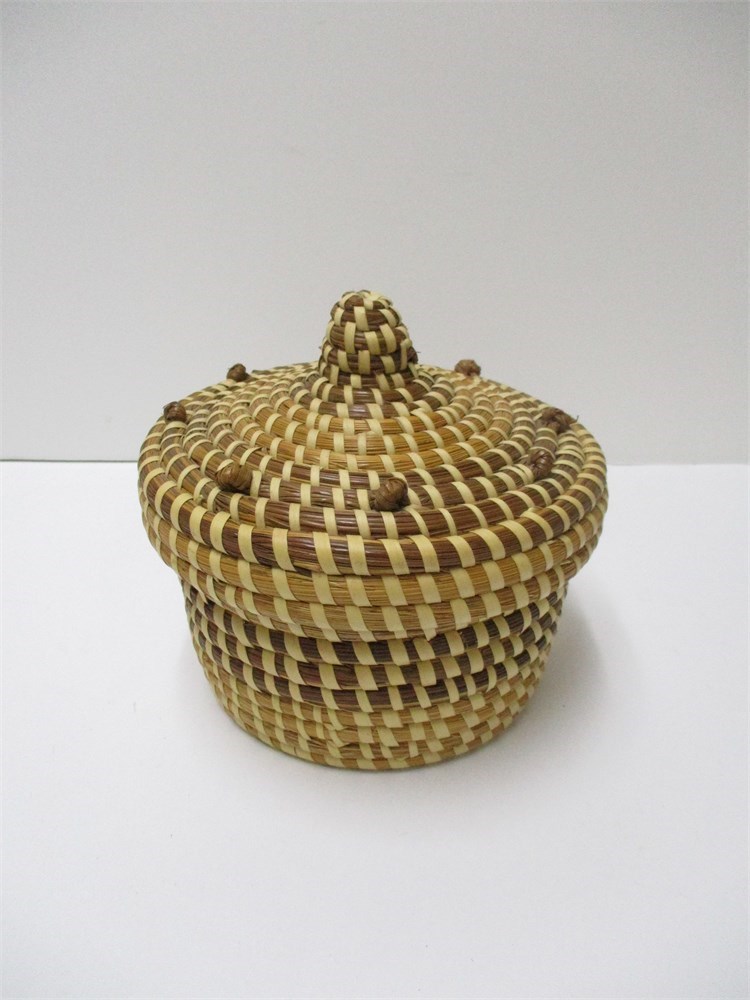 This is a beautiful Gullah, Sweetgrass Basket with small Knot design on the lid.  These traditional Gullah baskets are from Charleston, South Carolina.  These are made by wrapping bundles of sweetgrass and pine needles in Palmetto strips.  This style of basketry is regional to the low country of the SE United States and practiced by descendants of African basket makers.  This is a beautiful covered basket with a pattern of 8 knots on the lid as decoration.  These type of baskets are highly collectible.  It measures 6.5" wide x 6" tall.