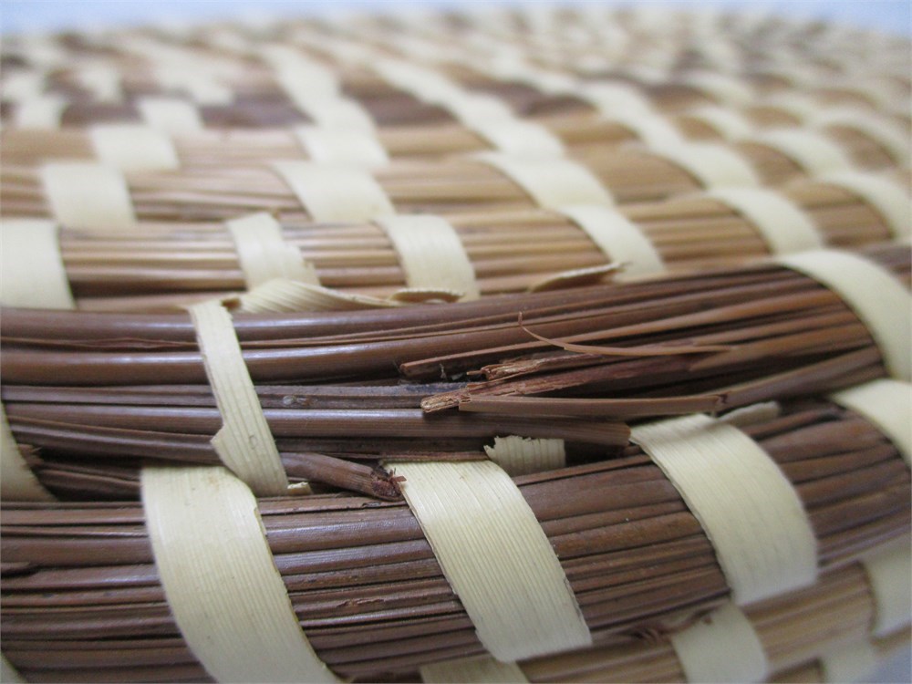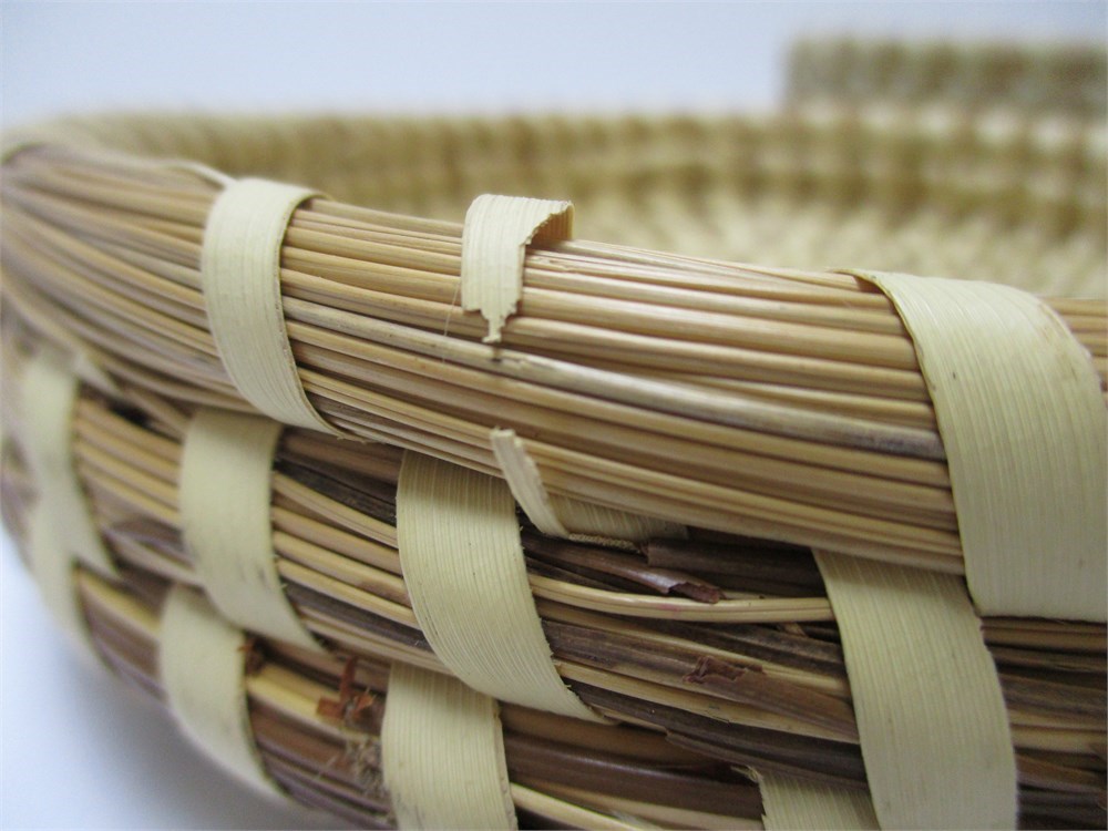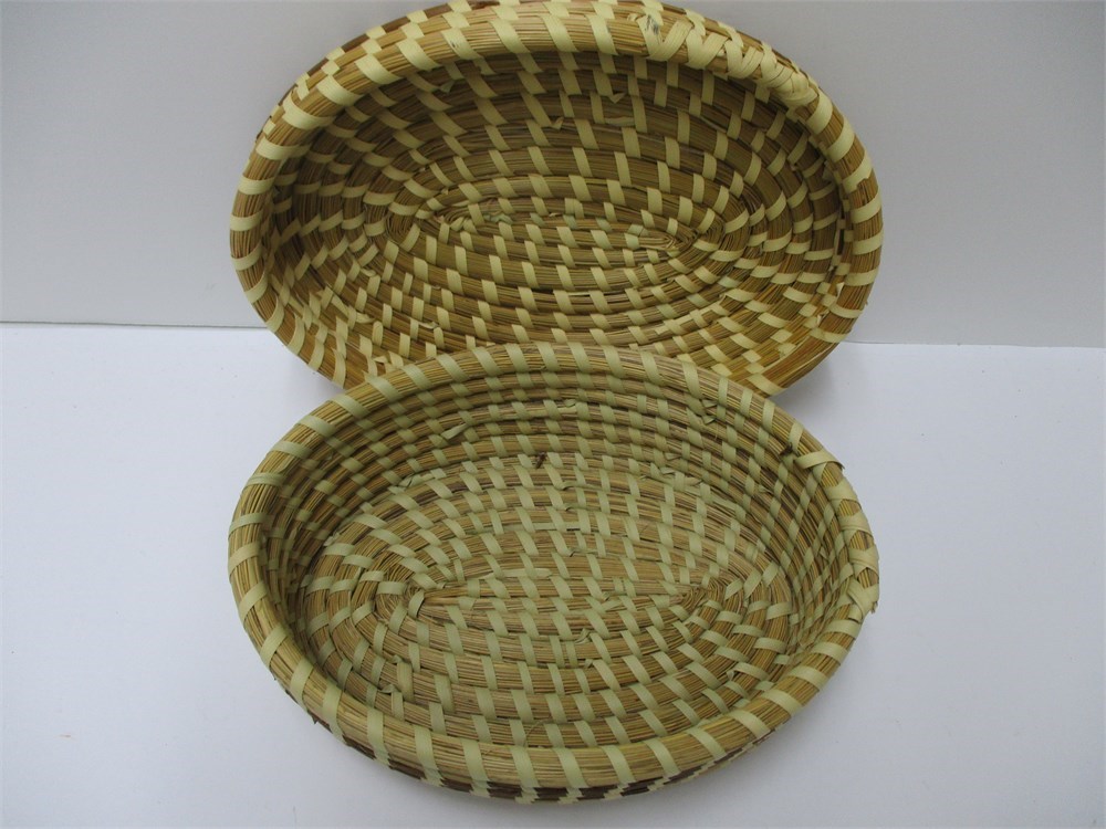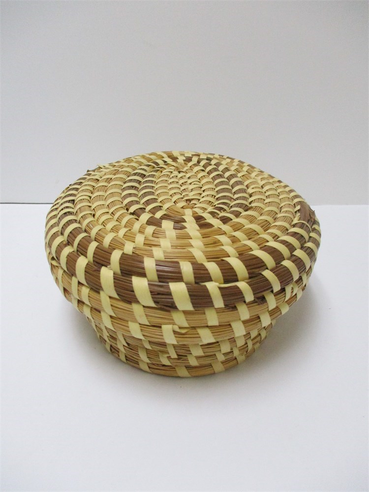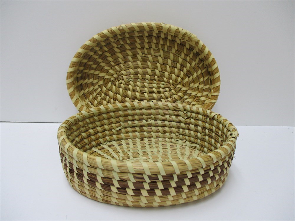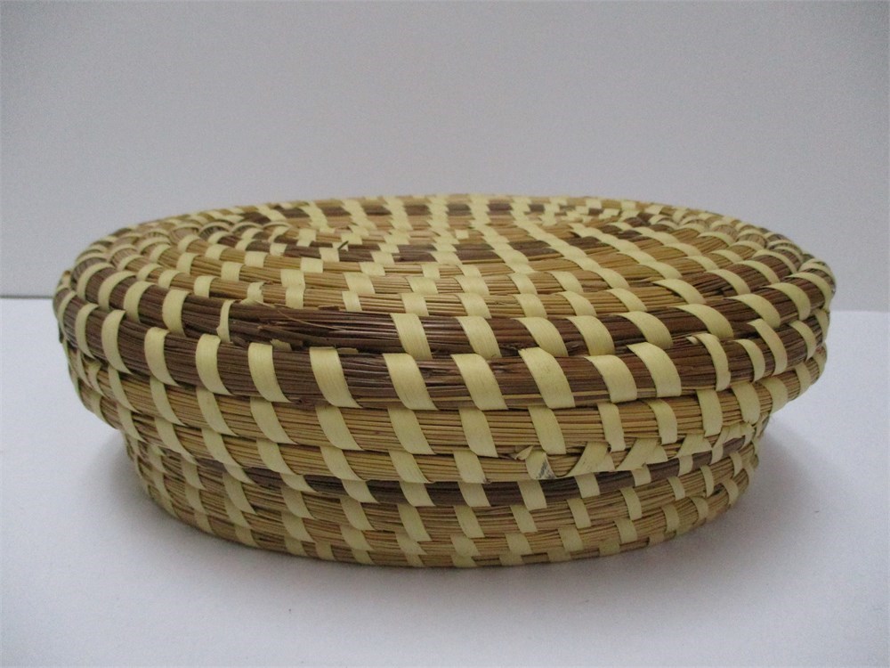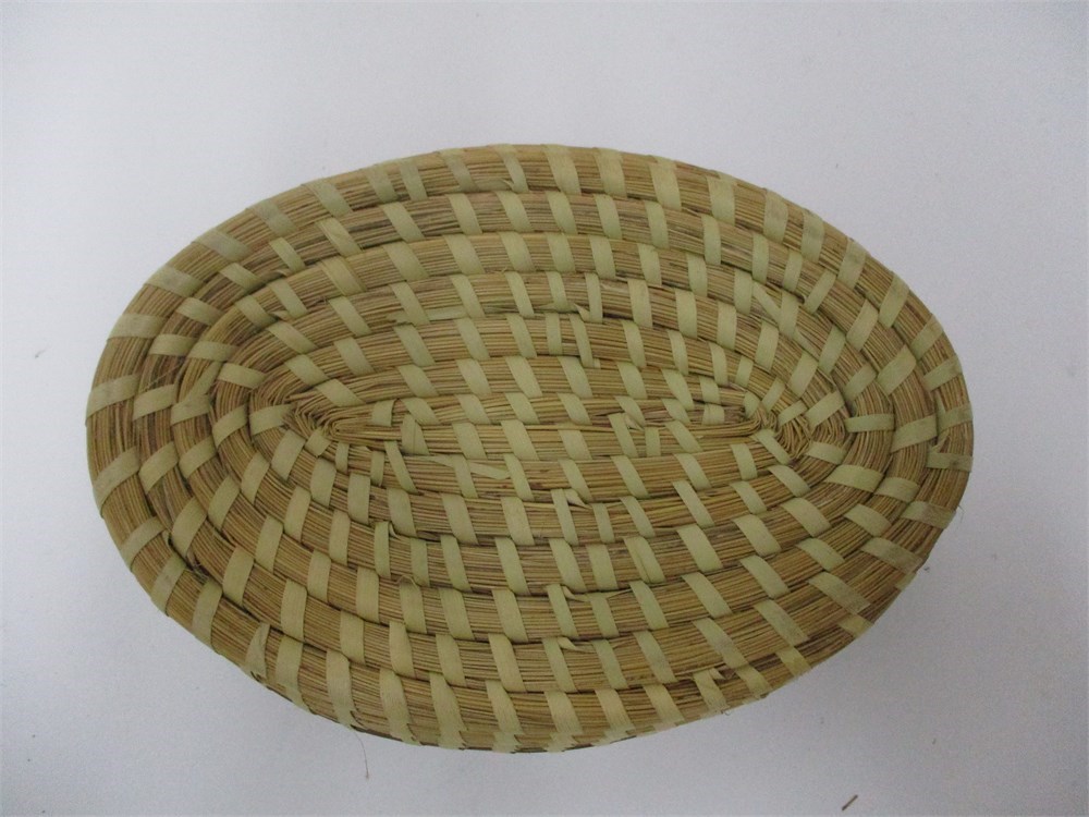 This is a beautiful, Oval, Covered, Sweetgrass Basket.  These traditional baskets are from Charleston, South Carolina.  These are made by wrapping bundles of sweetgrass and pine needles in Palmetto strips.  This style of basketry is regional to the low country of the SE United States and practiced by descendants of African basket makers.  This is a lovely, oval, covered basket in good vintage condition with only a few breaks in the sweetgrass and coil on the lid edge.  See pictures.  These type of baskets are highly collectible.  It measures 9.75" wide x 3.25" tall.