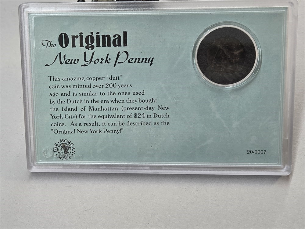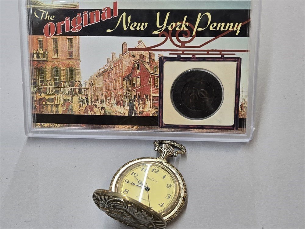 The vintage pocket watch has a nice train design on one side, in used condition but nice. The NY penny is in it's original package and in very nice condition.