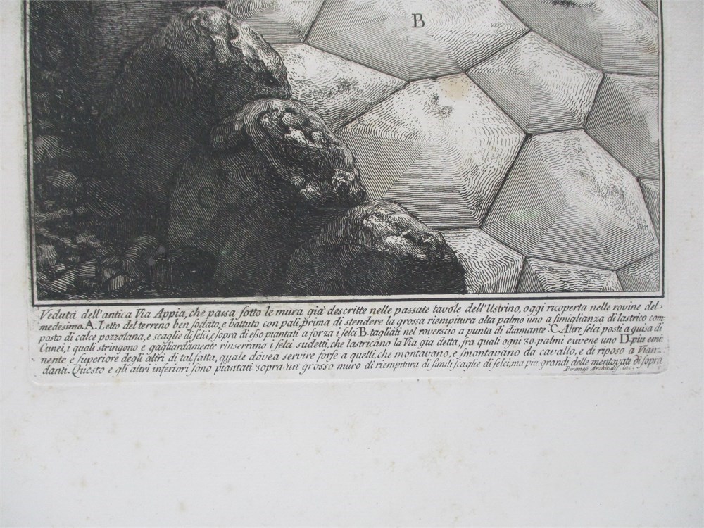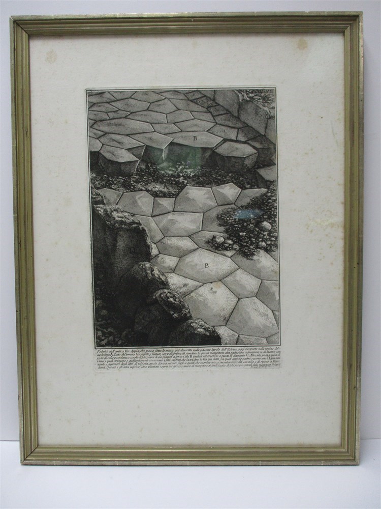 This is a fabulous antique framed Etching by Giovanni Battista Piranesi called "View of the stone pavement of the Appian Way".  At the bottom of the etching, written in Italian is the information about the formation of this ancient road.  It measures 22x17".  It is in good antique condition, with some foxing on the matte.  It is ready for hanging.