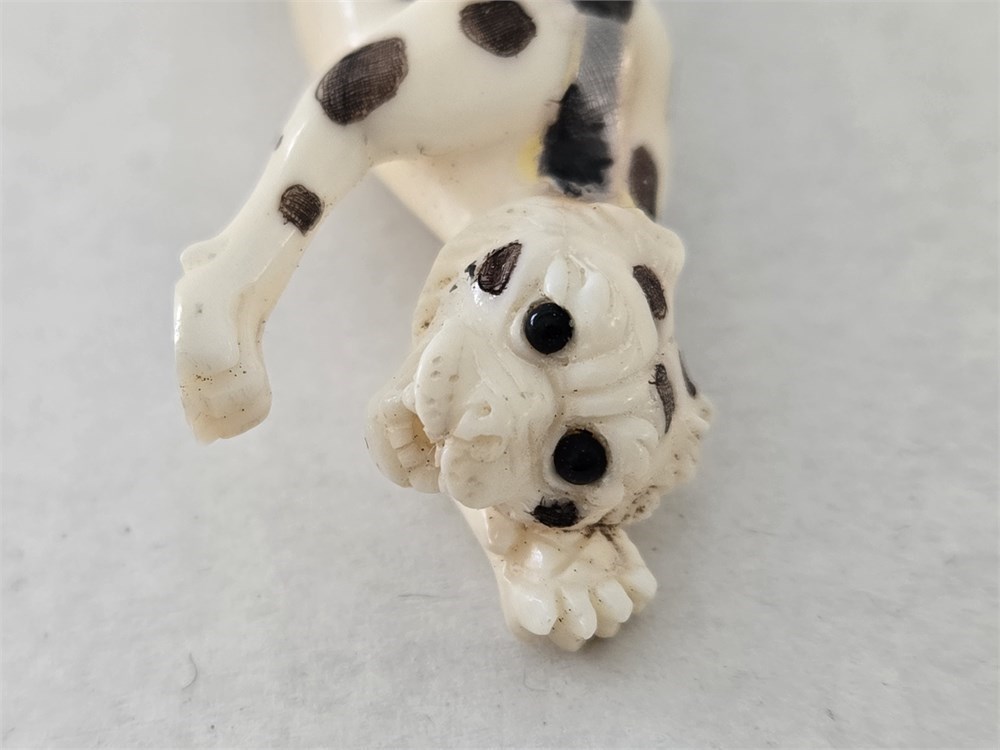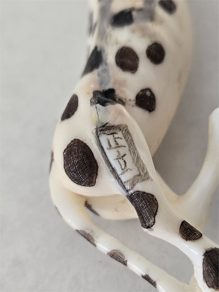 Pieces of this type were produced in Japan in the post-war period as decorative okimono-style animal carvings for the tourist and export trade, often intentionally crafted to emulate traditional ivory carvings at a miniature scale.