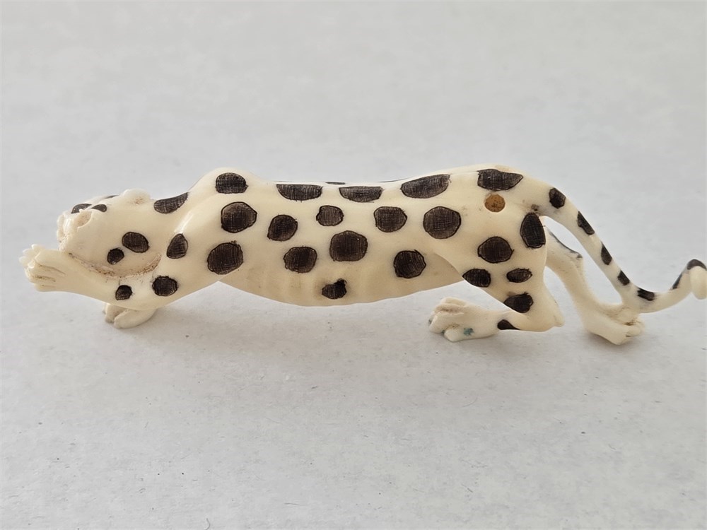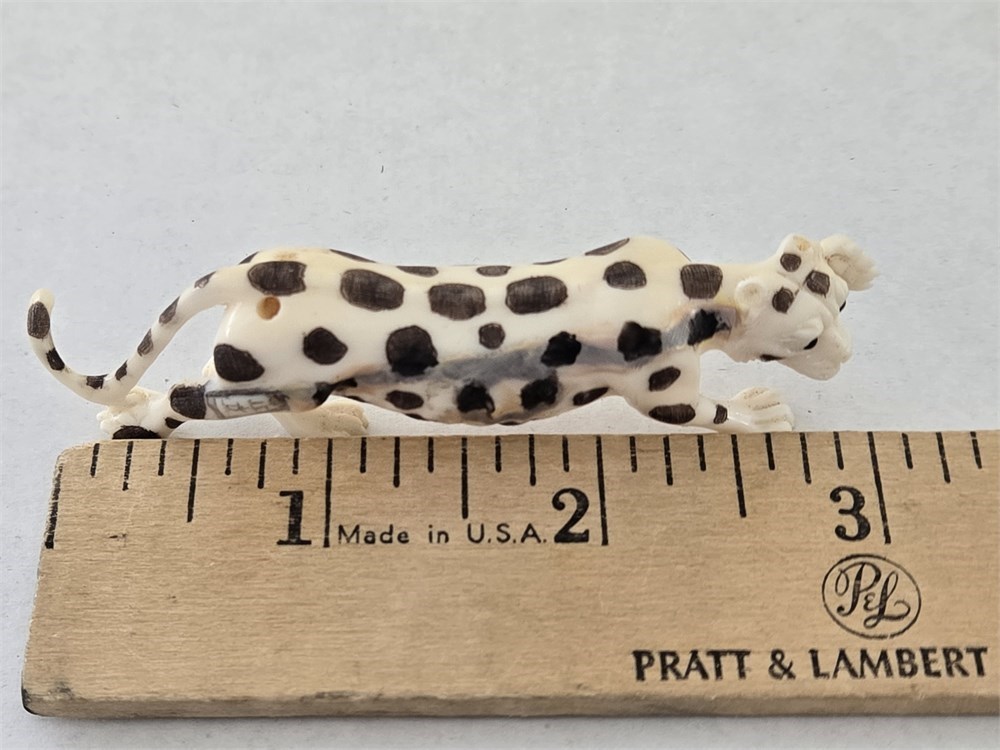 A finely carved miniature figure of a prowling leopard or cheetah, rendered in cream-toned celluloid or early synthetic material and worked to closely imitate ivory. The animal is modeled in a naturalistic stalking pose with elongated body, articulated paws, expressive facial carving, and inset black bead eyes.
