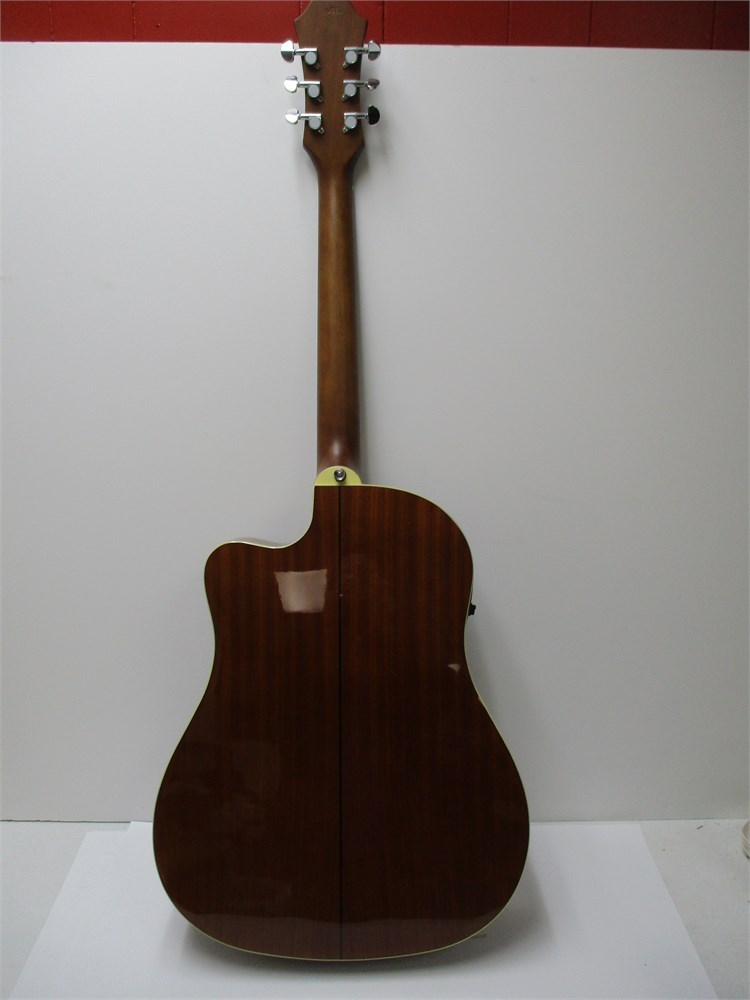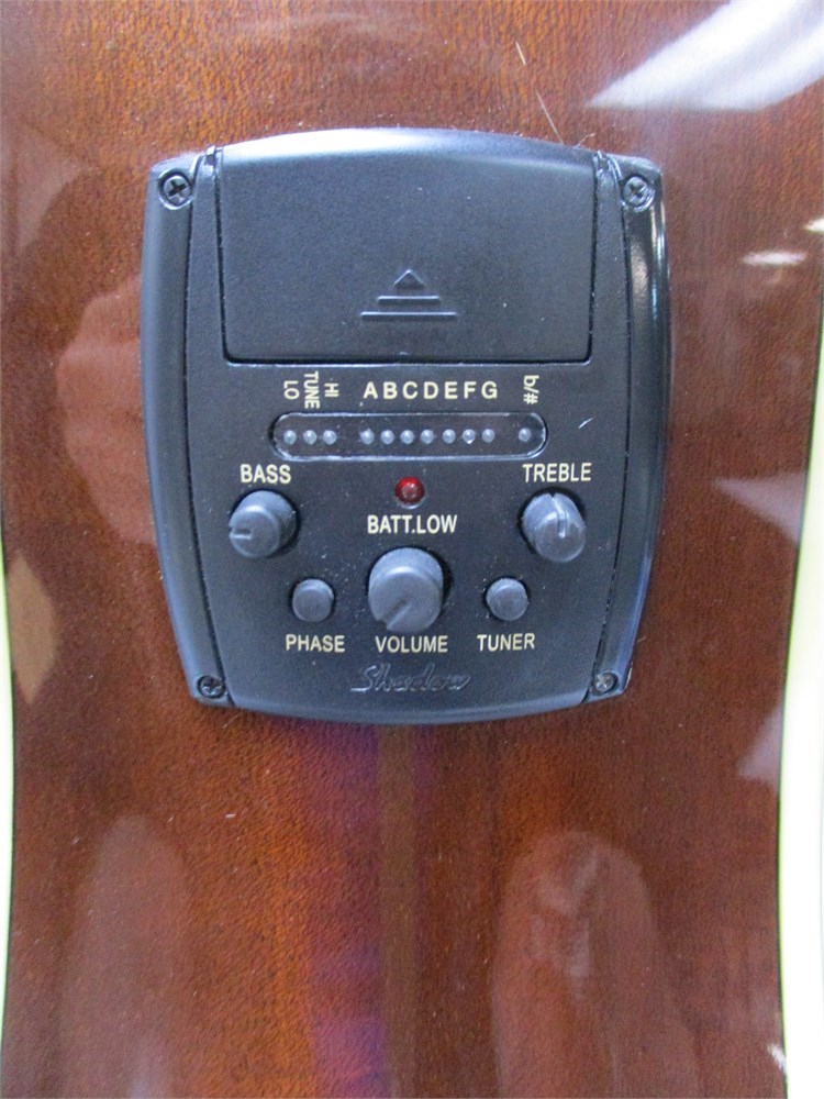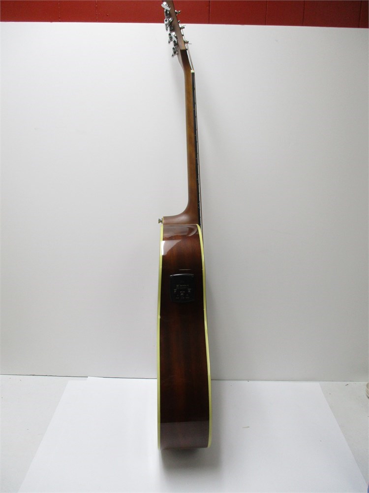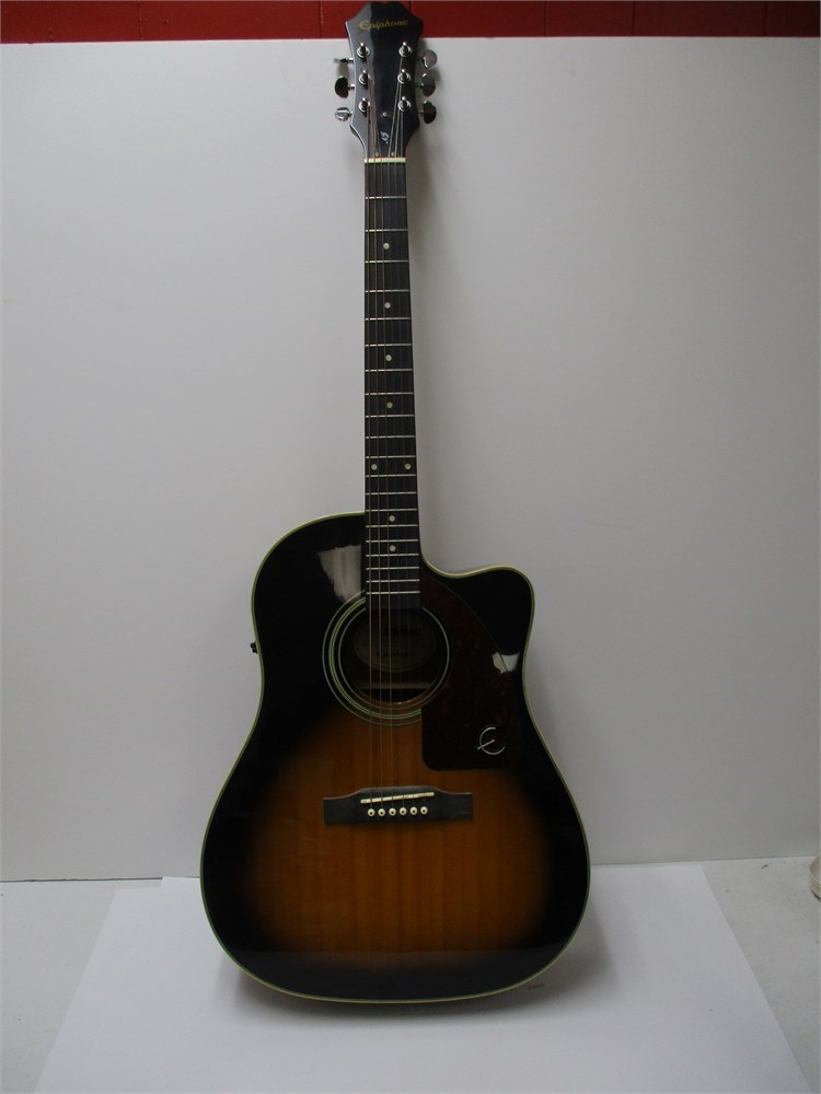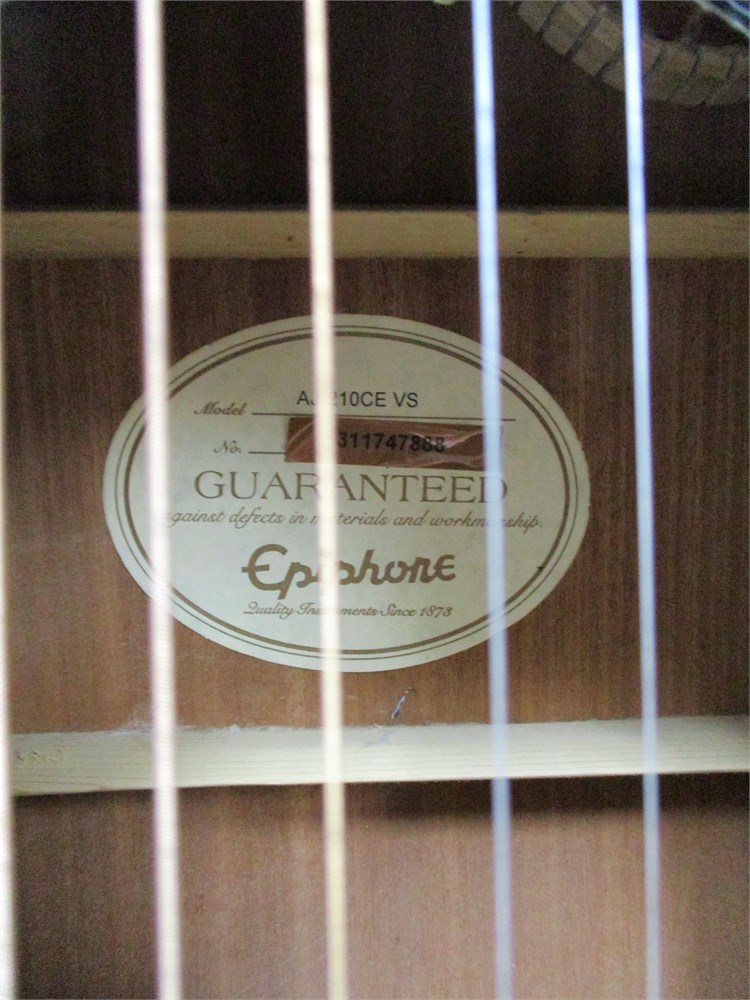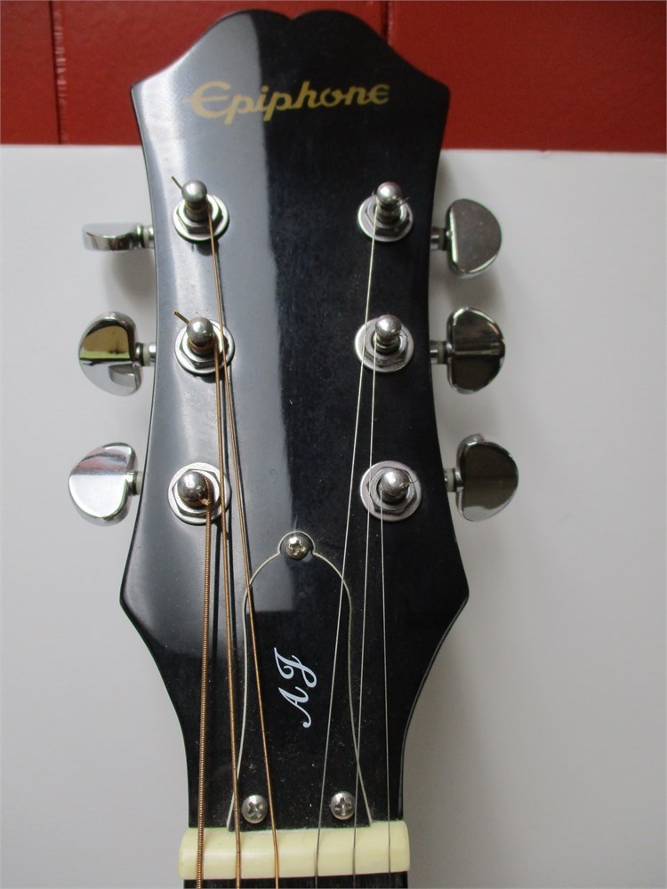 A very nice Vintage Epiphone Acoustic/Electric Guitar with a single cutaway body.  Brand clearly visible on the headstock.  Sunburst finish dark edges fading to a warm brown center.  The top is likely Spruce typical for Epiphone acoustics in this range. The neck is Mahogany.  The Fingerboard is Rosewood or similar with hardwood dot inlays.  The Headstock has the Epiphone script logo, chrome tuners.  The Pickguard is Black with Epiphone "E: logo.  The Bridge is Rosewood style with bridge pins. It comes in it's own case. Very nice piece !  The Case is clean and in very good condition.