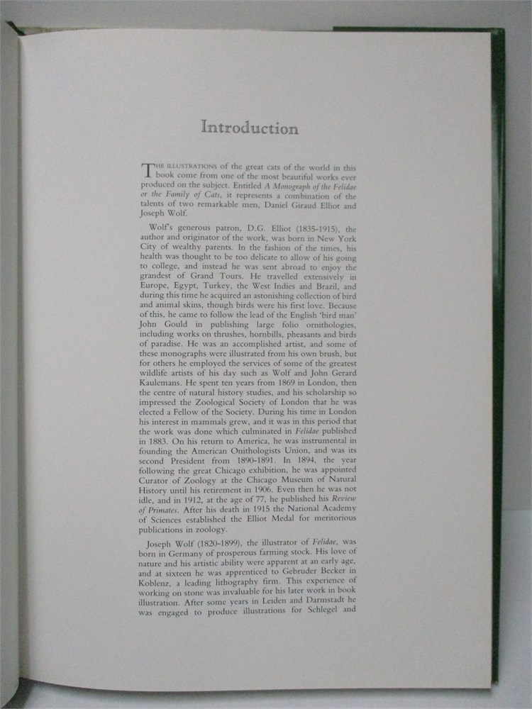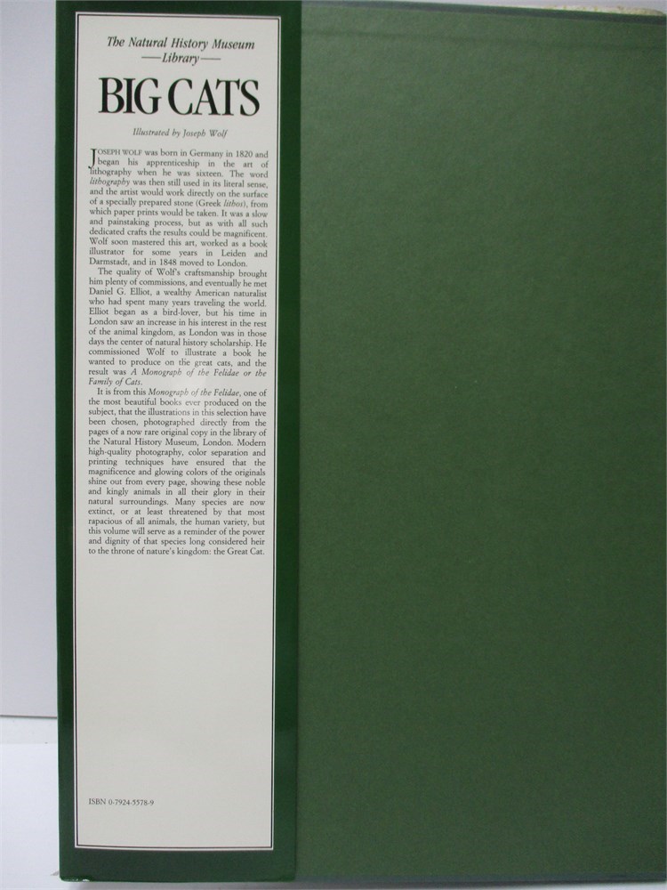 This is a wonderful coffee table book on "Big Cats".  Wonderful selection of full color illustrations by Joseph Wolf.  The Jacket has some discoloration and the book is in good used condition.