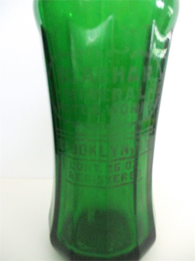 This is a Wonderful Antique Green Siphon Bottle from "Blachar Mineral Water Works, Brooklyn NY, 1900-1920.  The etching on the front of the bottle says:  BLACHAR MINERAL WATER WORKS, BROOKLYN, NY, CONT. 26 OZ. REGISTERED". The etching has some fading but still easily read. The metal neck has identification of the company.  The glass has a lovely shape with paneled sections around the body. The bottle still has the original siphon tube.  I believe the glass is Czech.  Most of these bottles were imported from Czech because of the quality and deep rich color.  I have not tested the bottle for its working condition so it is sold "AS IS".  It is in Wonderful Antique condition.  Considering the rarity, condition and collectiblilty this has a reserve.