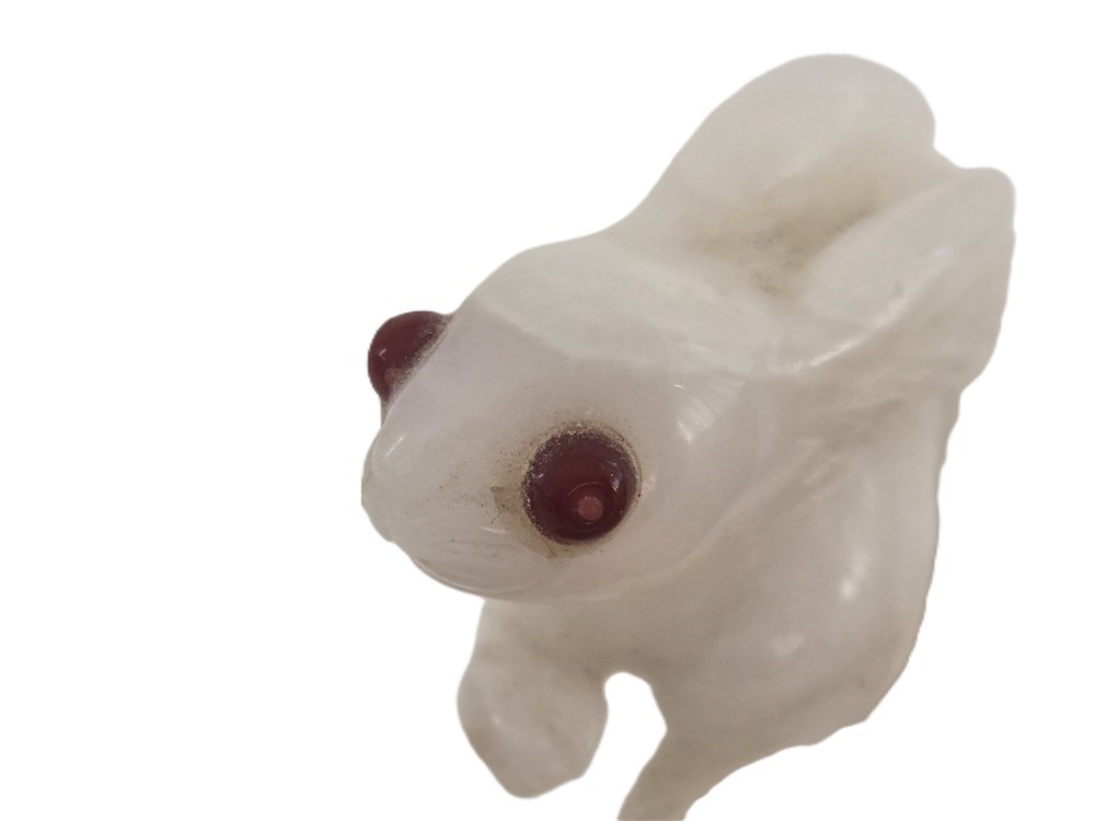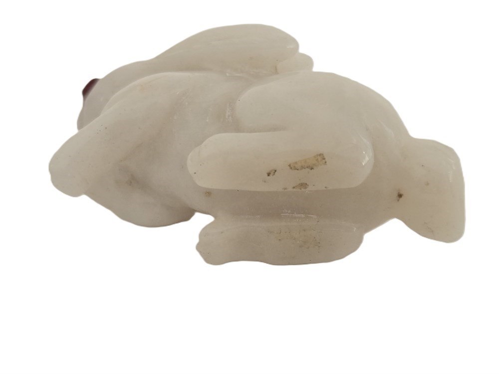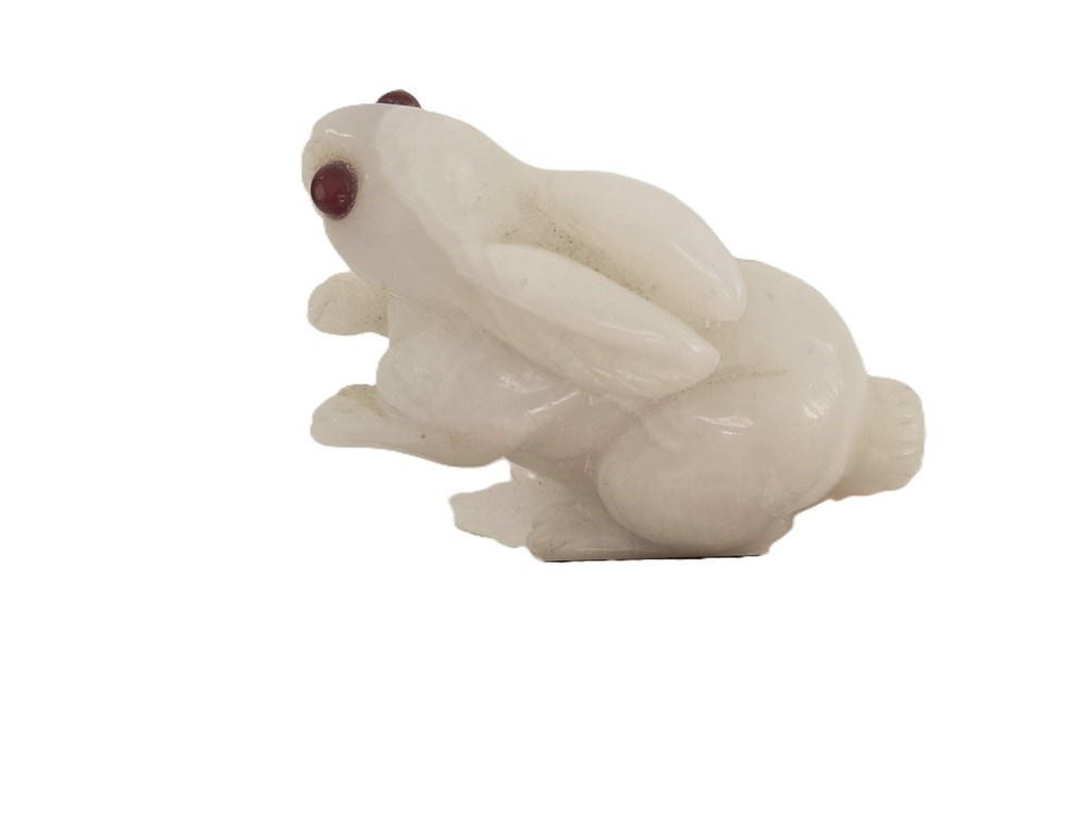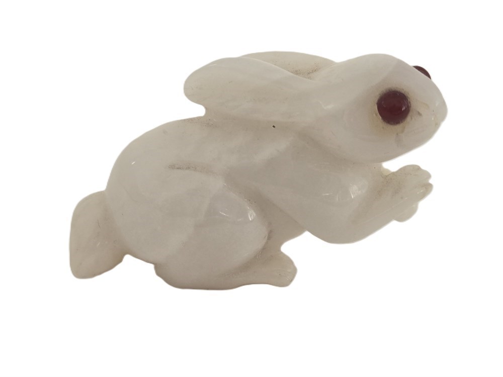 A finely hand-carved rabbit figure carved from translucent milky white quartz, depicted seated with swept-back ears and tucked forepaws. The carving features smooth, rounded modeling with a high polish and inset red eyes, likely glass or stone, adding expressive detail.