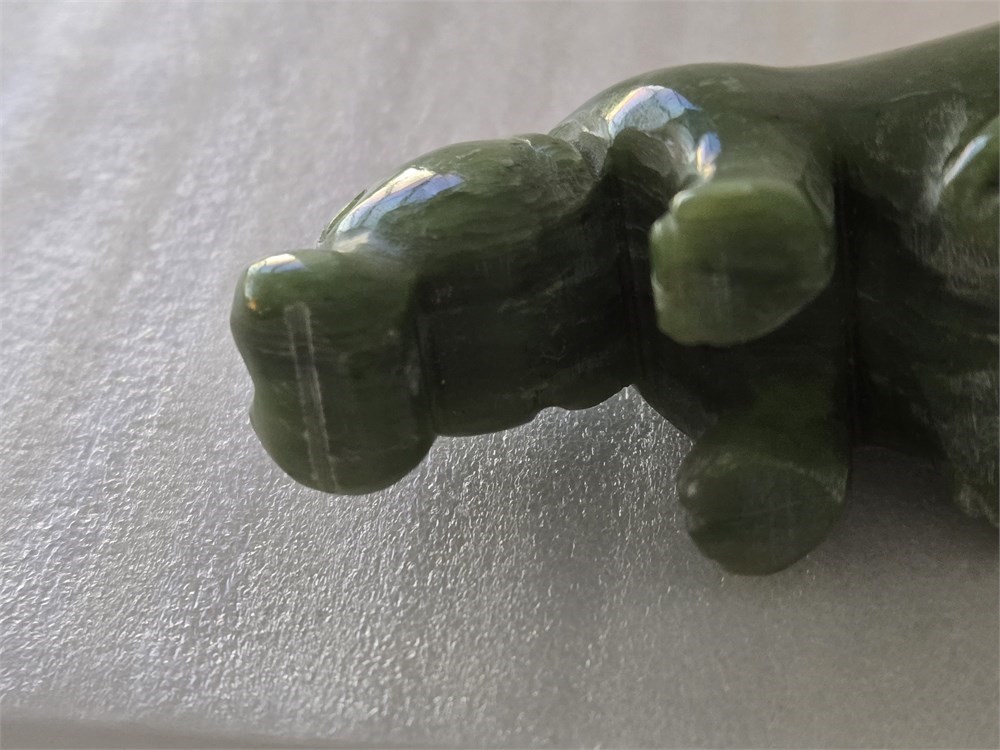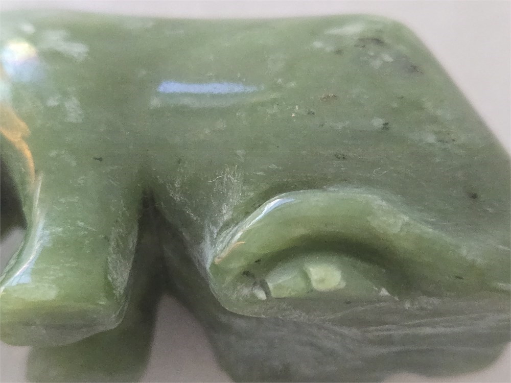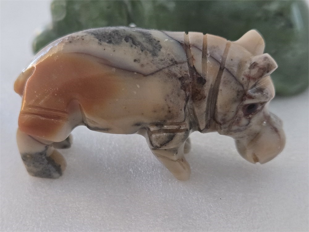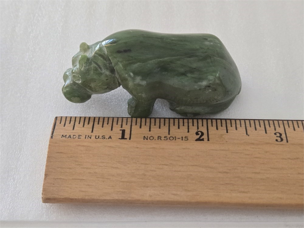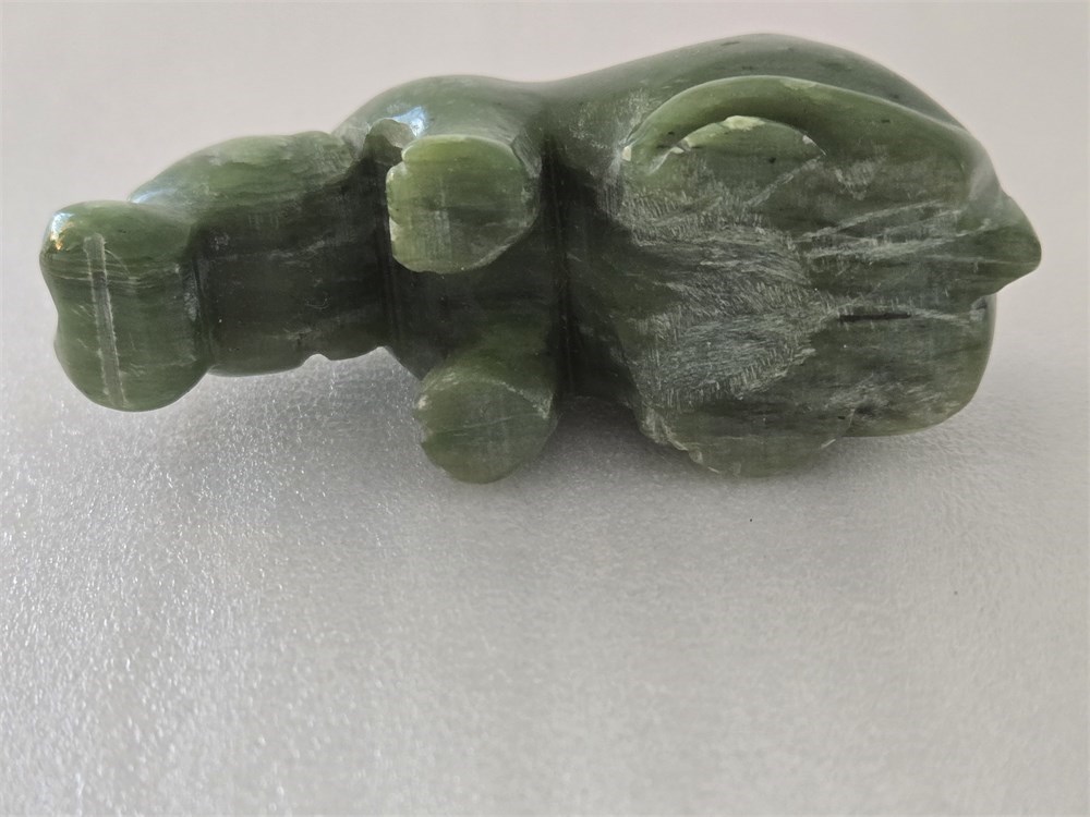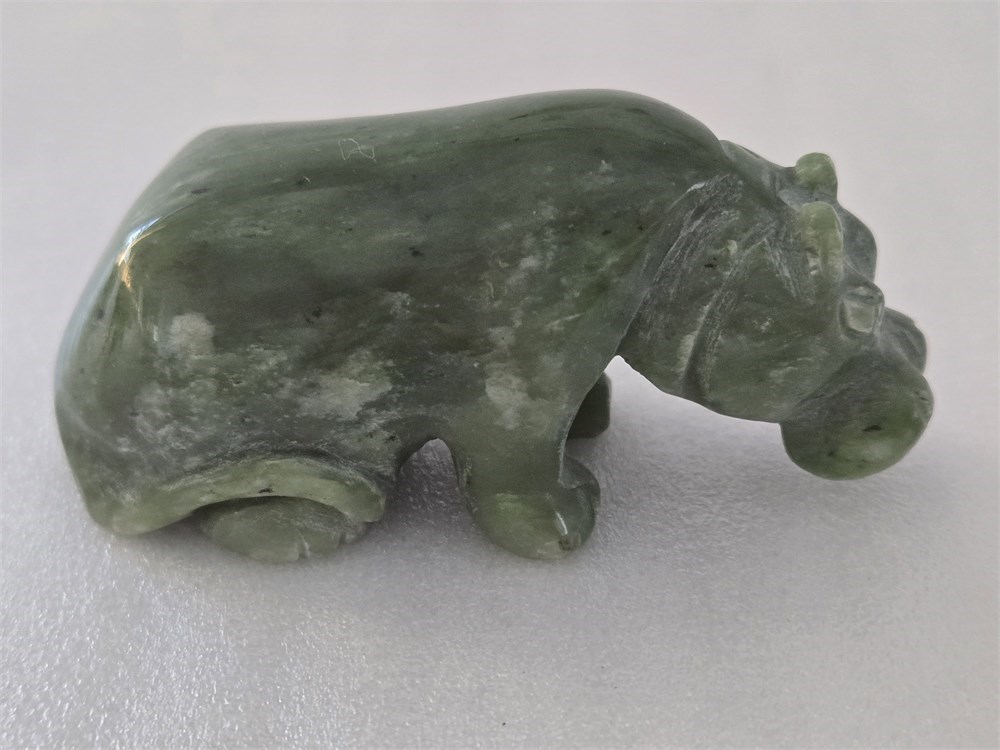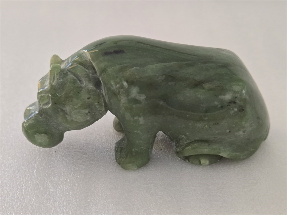 • One green hippopotamus, carved from jade or jade-type hardstone, likely nephrite jade, exhibiting a soft waxy polish with natural mottling and tonal variation.