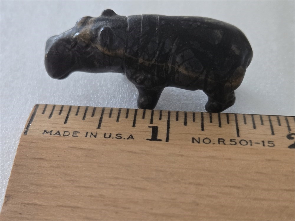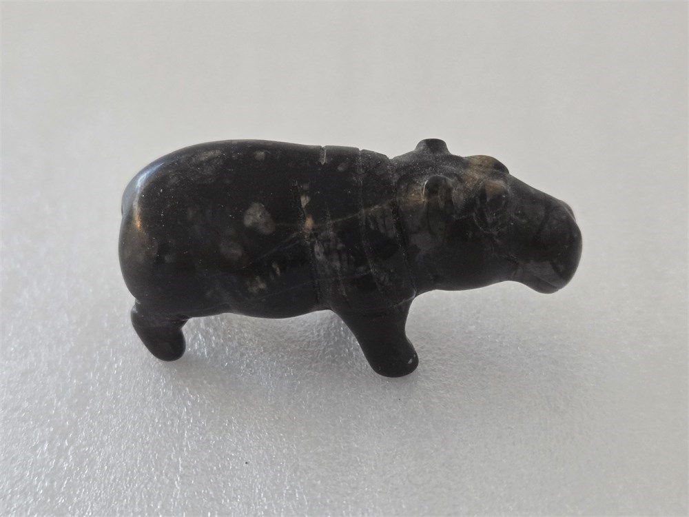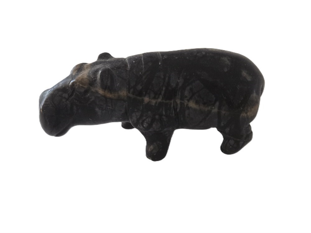 • One dark charcoal to black hippopotamus, carved from black calcite onyx or similar dense hardstone, with subtle internal inclusions and a smooth polished surface.
