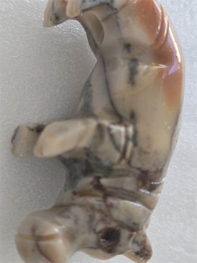• One cream, gray, and honey-brown hippopotamus, carved from banded calcite onyx (often referred to in the trade as Mexican onyx), with attractive layered coloration and a red inlaid eye.