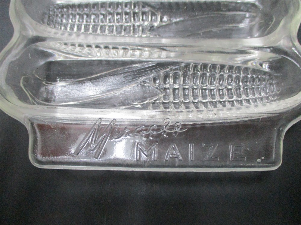 A very nice Vintage Glass Corn Cob shaped baking dish branded with the Miracle Maize name.  In very nice vintage condition. Measures 11.75" long, no chips or fractures detected.
