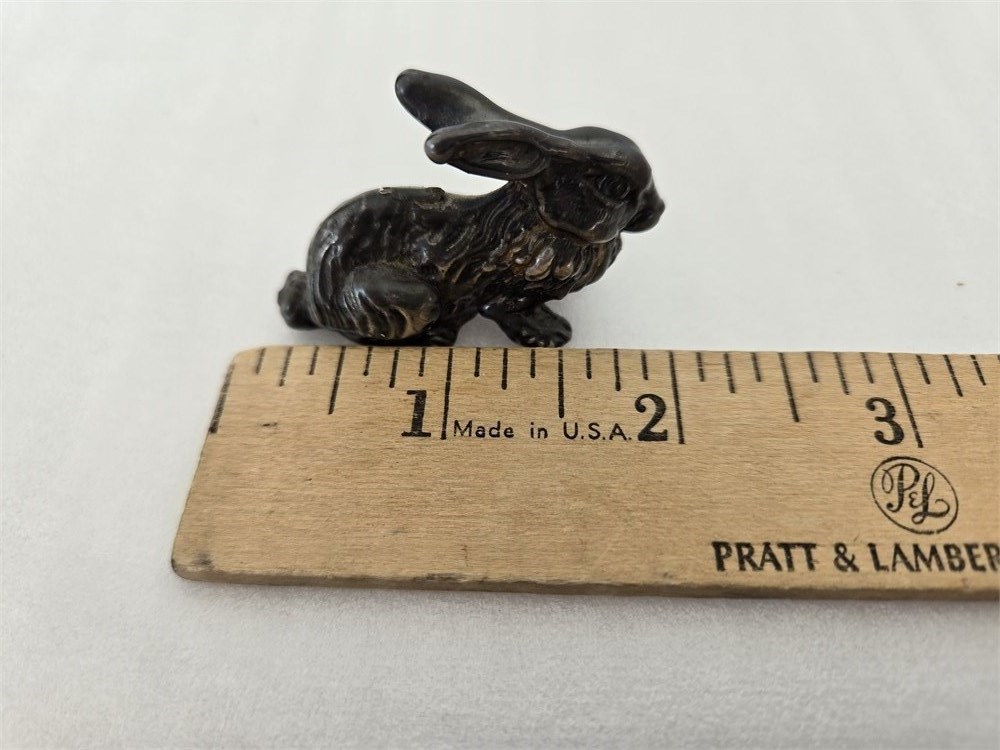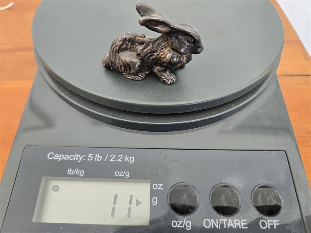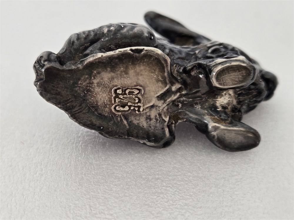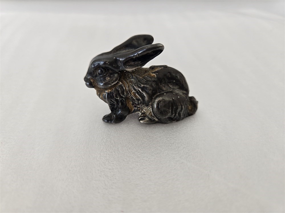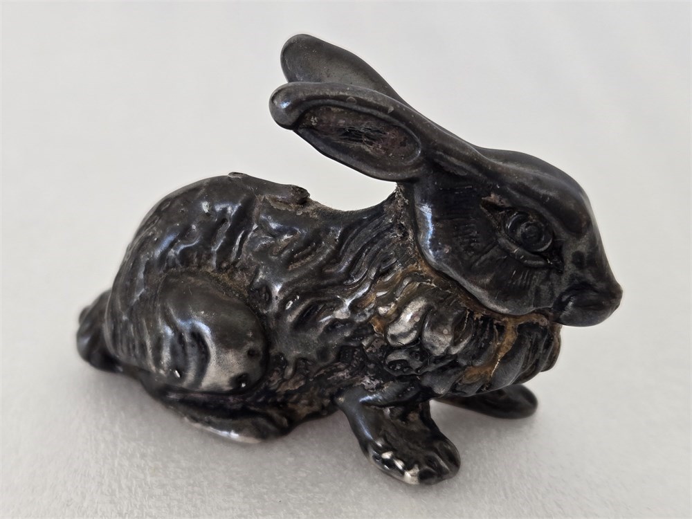 NEEDS A CLEANING, DIRTY IN THE CREVISES....A small decorative figure depicting a reclining rabbit or hare, modeled with textured fur and alert ears. Lightweight approx. 11 grams.
