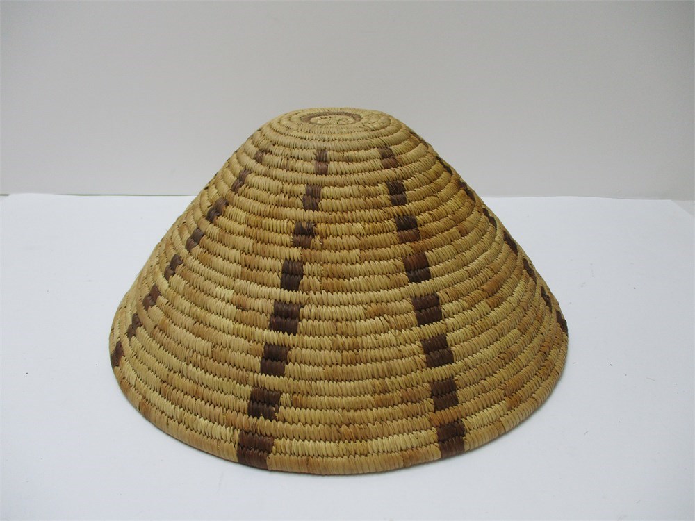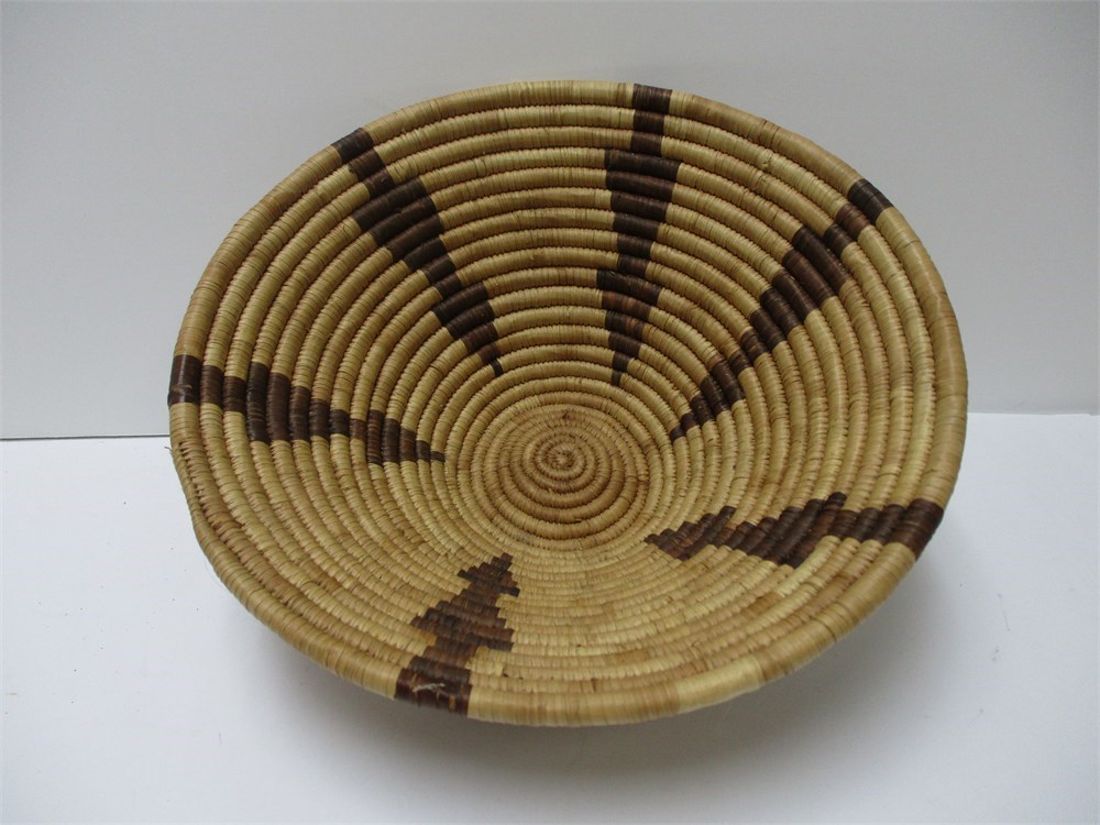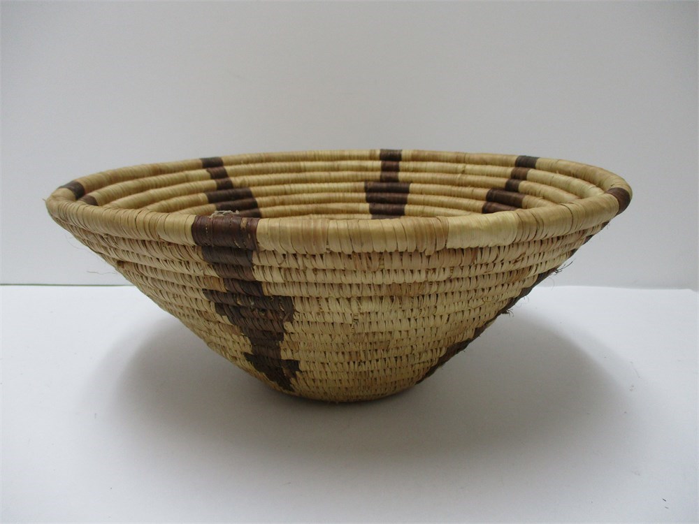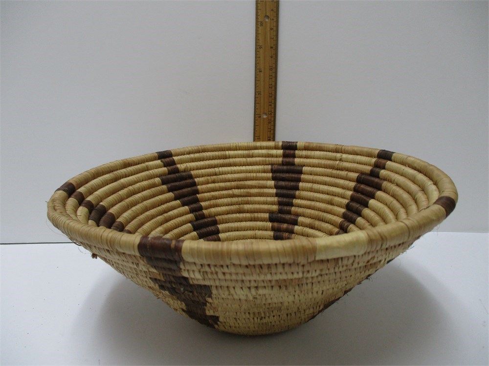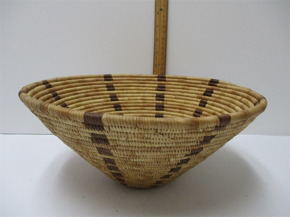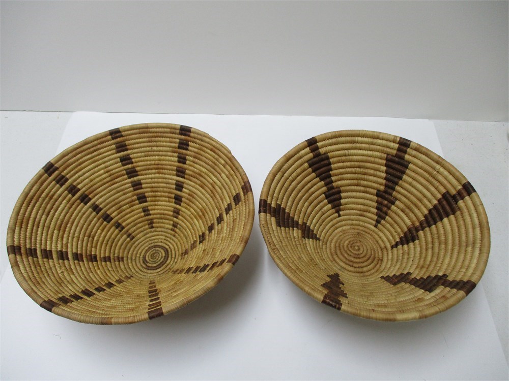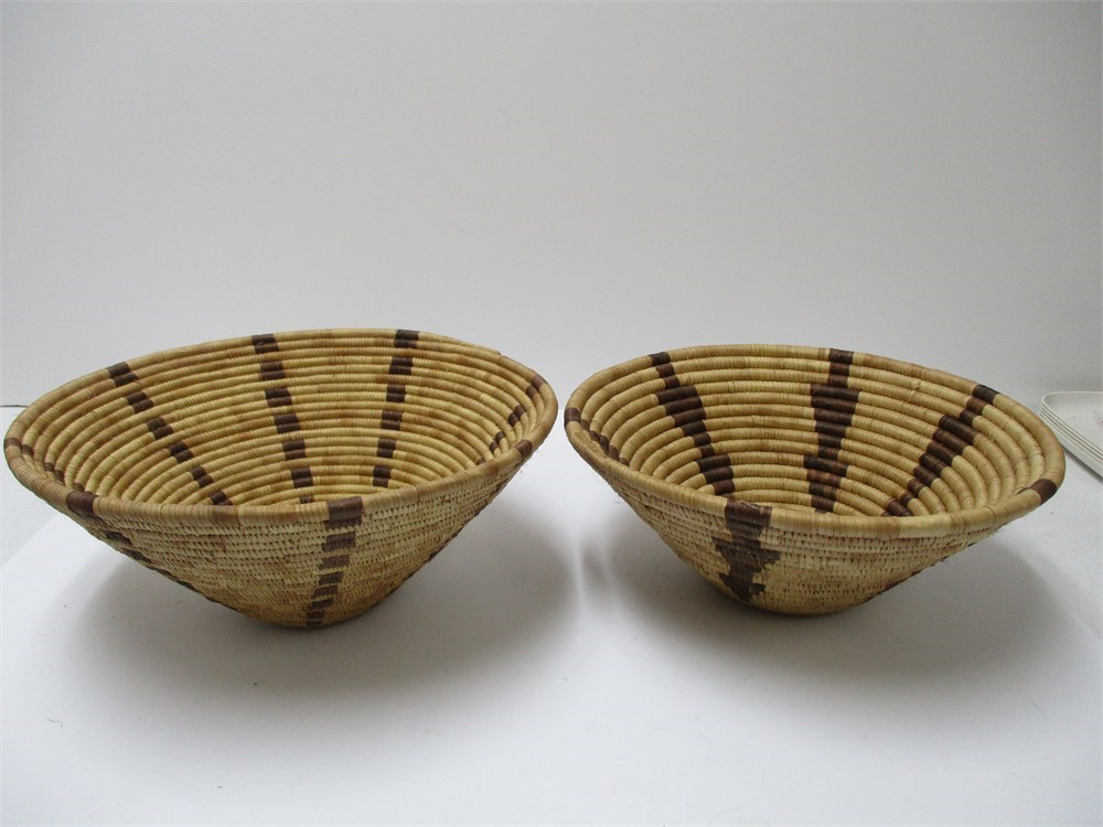 This is a wonderful pair of Native American Handwoven Coiled Baskets, possible Pima or Papago origin, featuring a two-color design.  It is constructed using traditional coiling techniques with natural fibers.  The larger Basket measures 5.25" tall x 12.2" across.  The smaller Basket measures 5" tall x 12.25" across.  Both in wonderful condition.