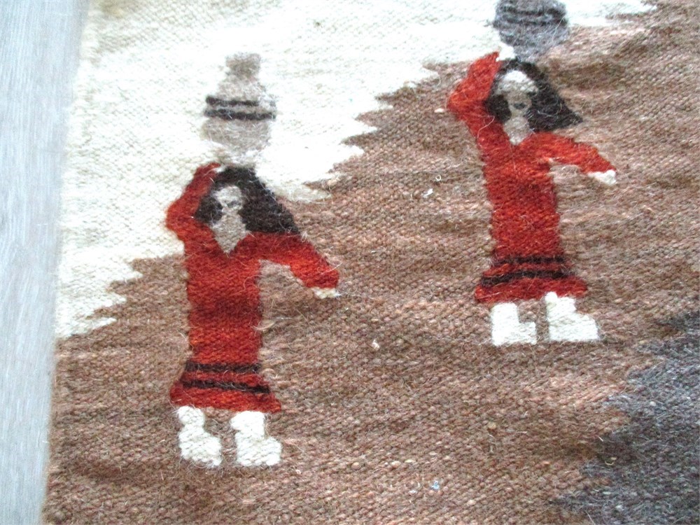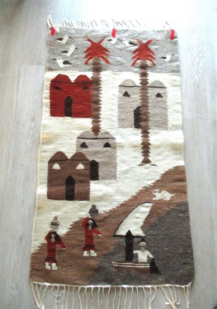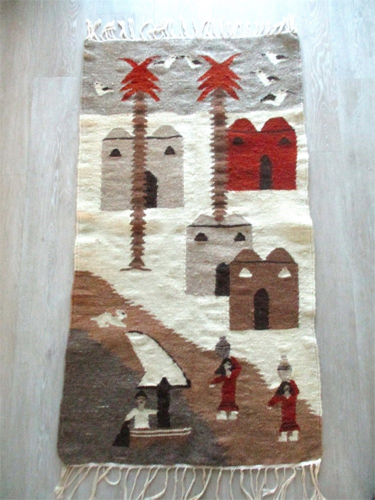 This is a wonderful vintage, handwoven Peruvian light wool textile rug.  It is a flat weave with a stylized village scene, mud-brick houses with arched doorways, tall palm trees, birds flying overhead with figures engaged in daily life. Wonderful color palette of rich earth tones, probably vegetable or mineral dyes. It has finished edges with hand-tied fringe at the top and bottom.  It measures 51" long including a 4" fringe x 25" wide.  It also shows 3 red tabs at the top for hanging if you wish. They can easily be removed.  This is a CLEAN piece, no odor and in excellent condition.  A wonderful accent piece as a rug, wall hanging or table runner.