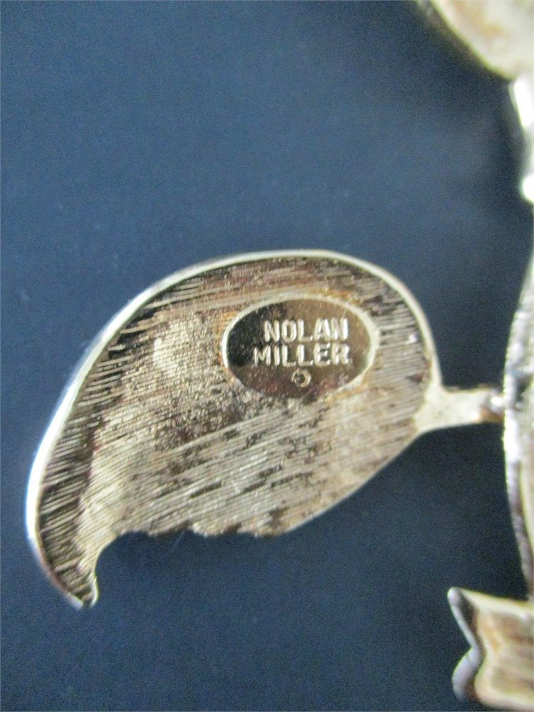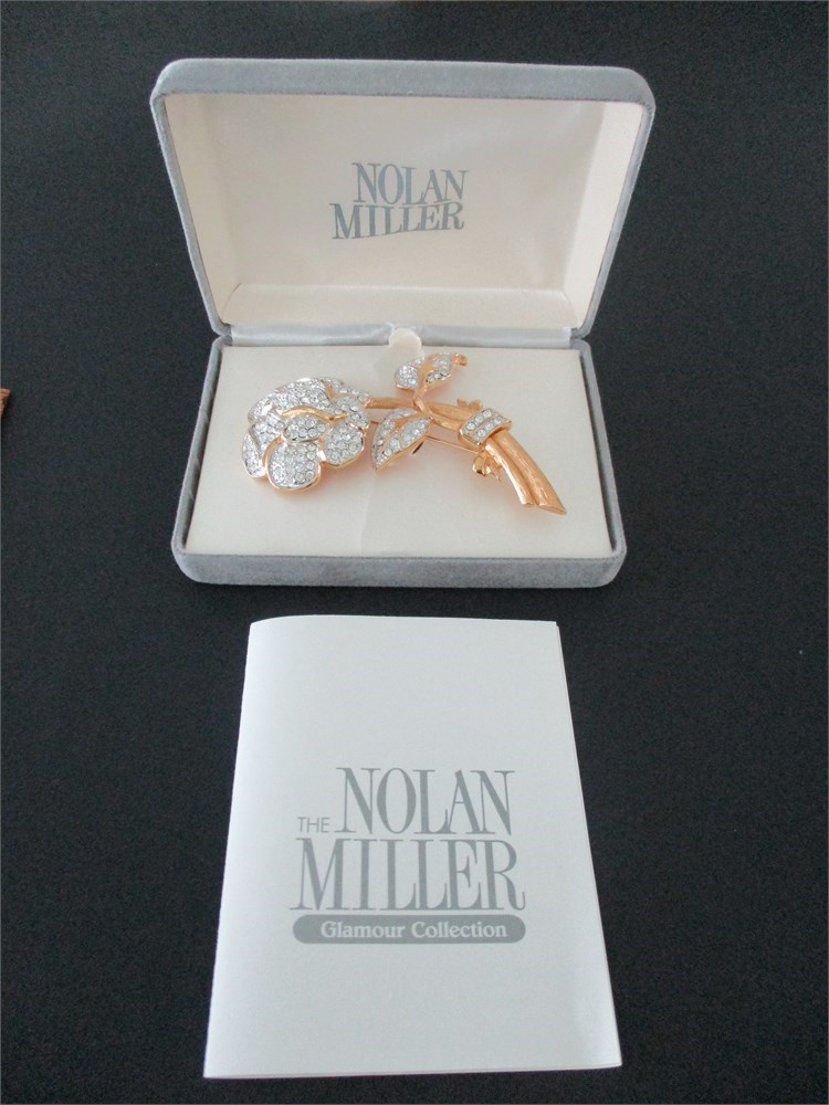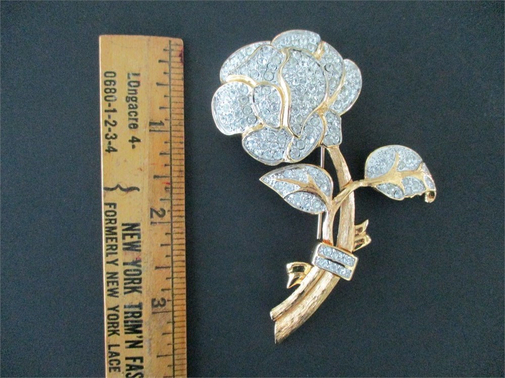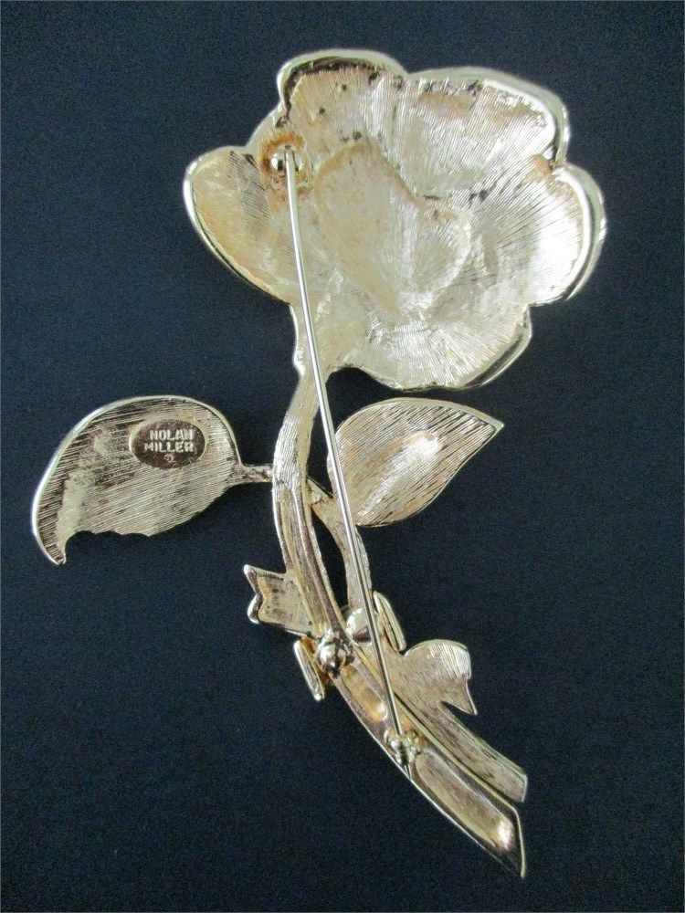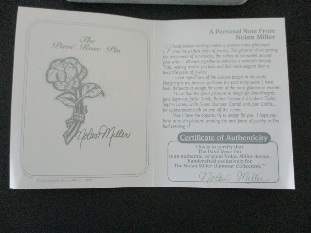 This is a Stunning, Vintage, PAVE ROSE PIN, from the Nolan Miller Glamour Collection.  Nolan Miller was renowned for his fashion and jewelry designs dressing the most beautiful women in Hollywood.  This Beautiful Brooch is from a single owner.  Comes in the Original Box and also comes with the Romance Card.  All in Stunning condition. !  It measures approximately 3.5" in length and it is signed.