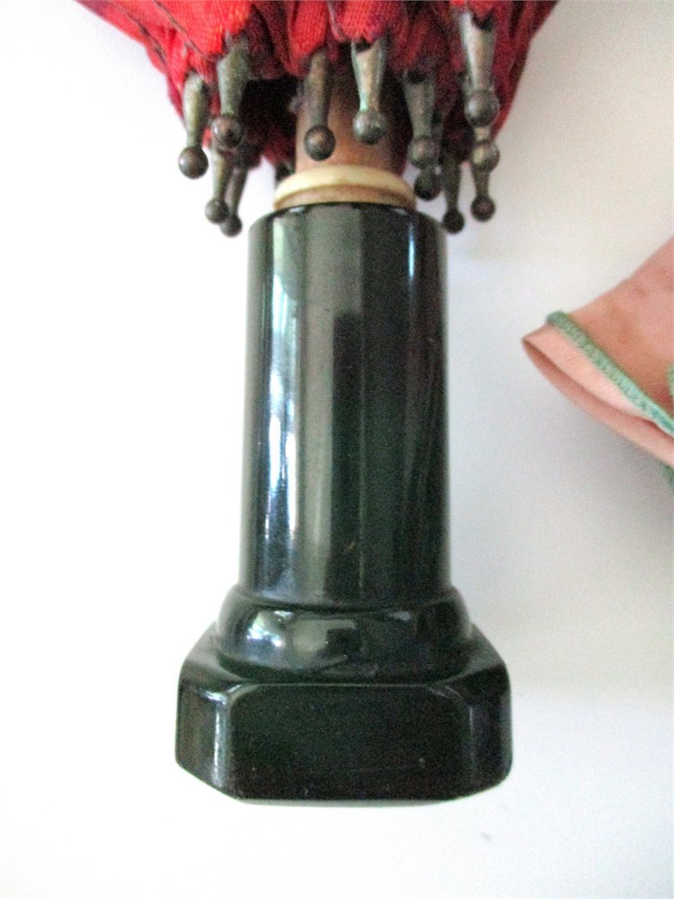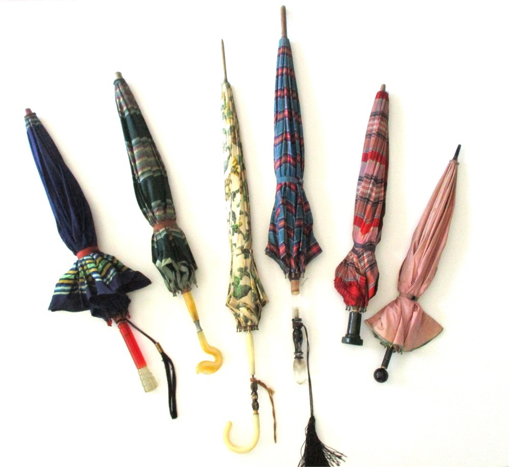 This is a wonderful Lot of 6, Vintage Umbrella/Parasols.  Each one is unique in fabric pattern and handle design. The handles are lucite except of the green one (pic 7) which is Bakelite. All of the spines seem strong and all of the fabric is still attached to the spines except for the first one.  The colors are still quite vibrant.  They have been lovingly used and show some wear, normal to age and use.  Great lot !
