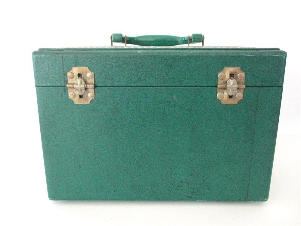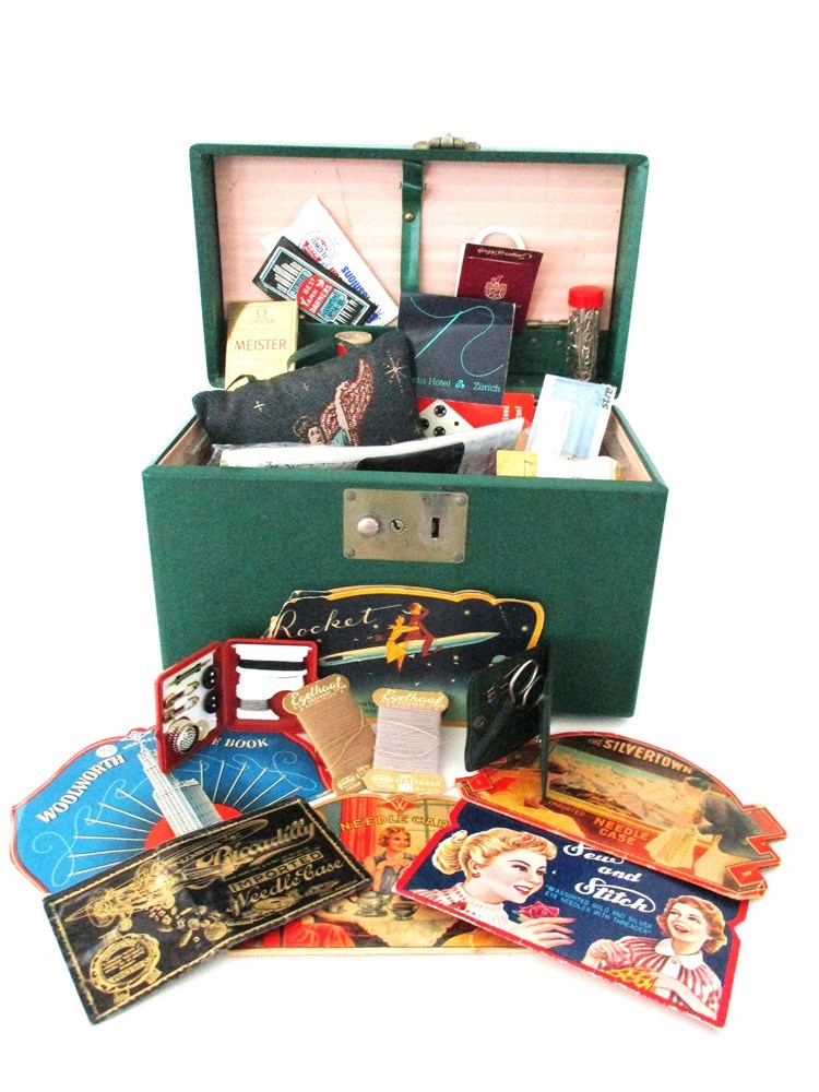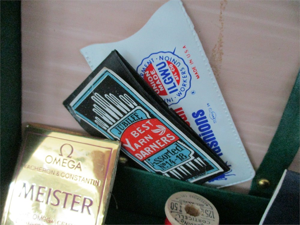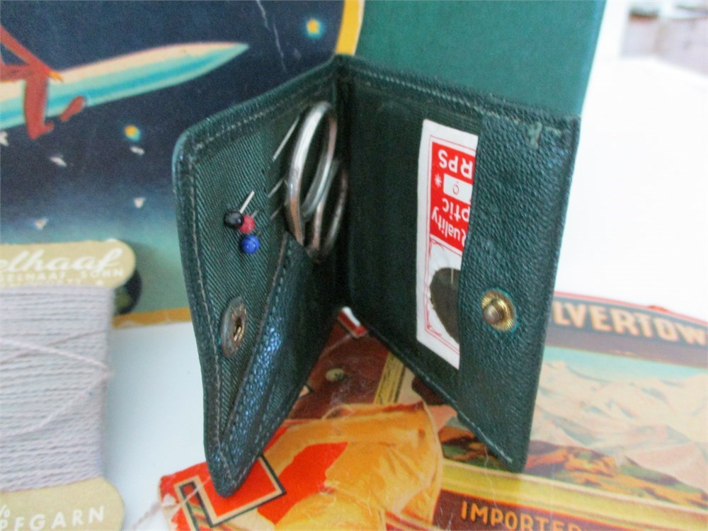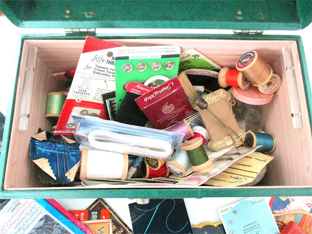 This Awesome Green Traveling Case is "Chock-a-block" full of vintage sewing including, Threads, Traveling Sewing Kits from Zurich and Germany, Scissors, Needle Booklets, Pins, Sewing Yarns, Pin Cushions and more !  Great Lot !