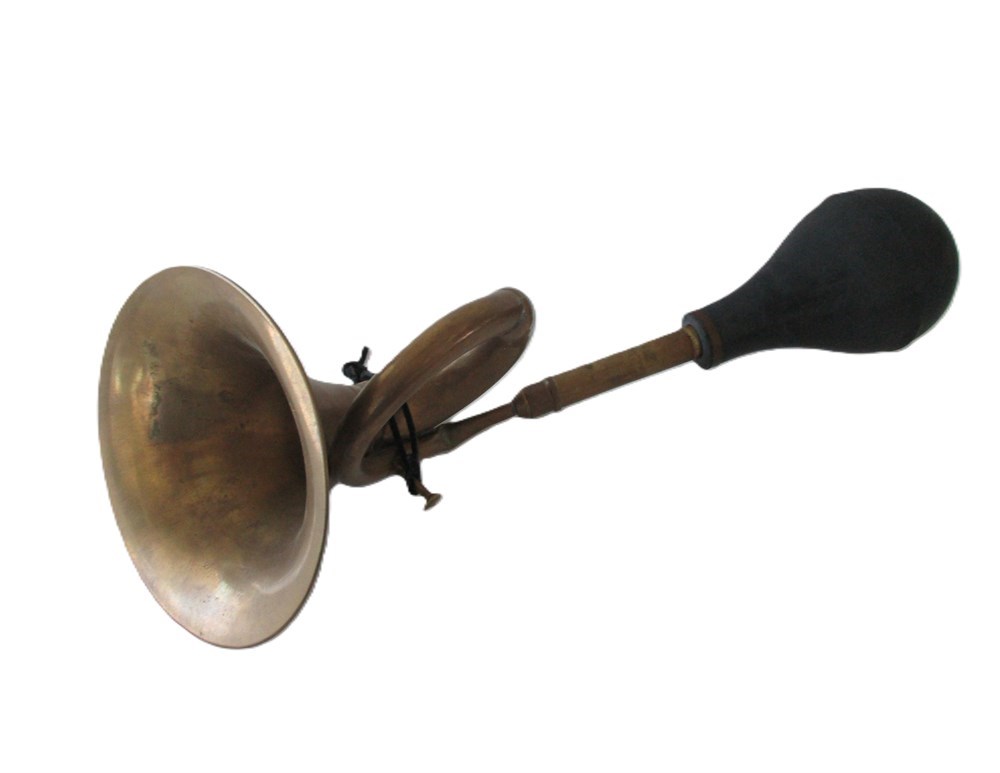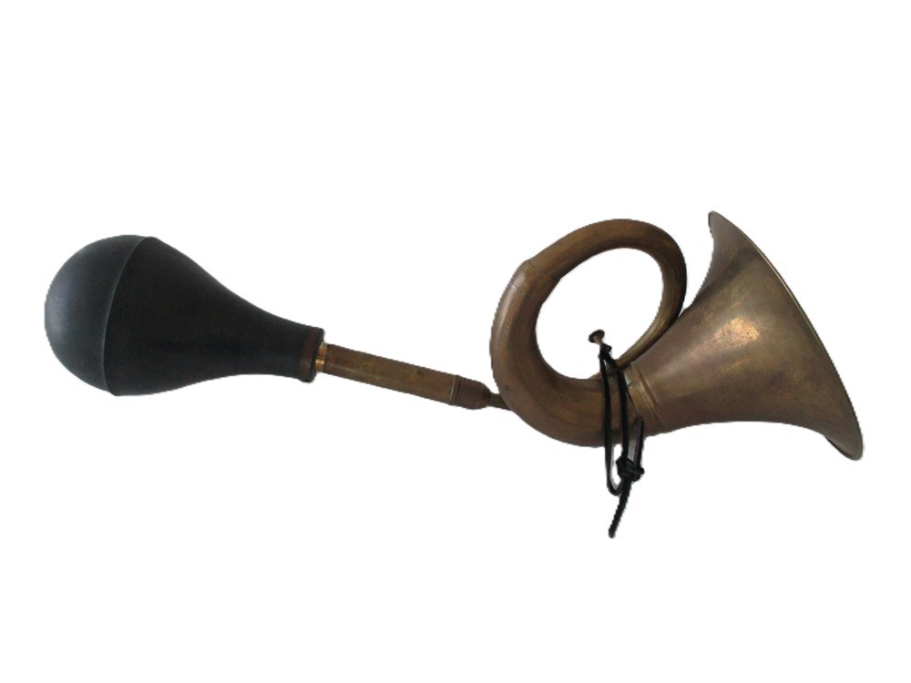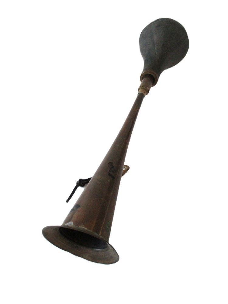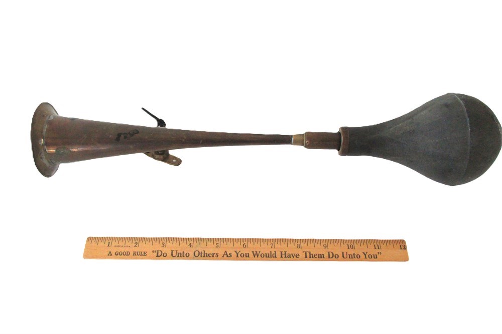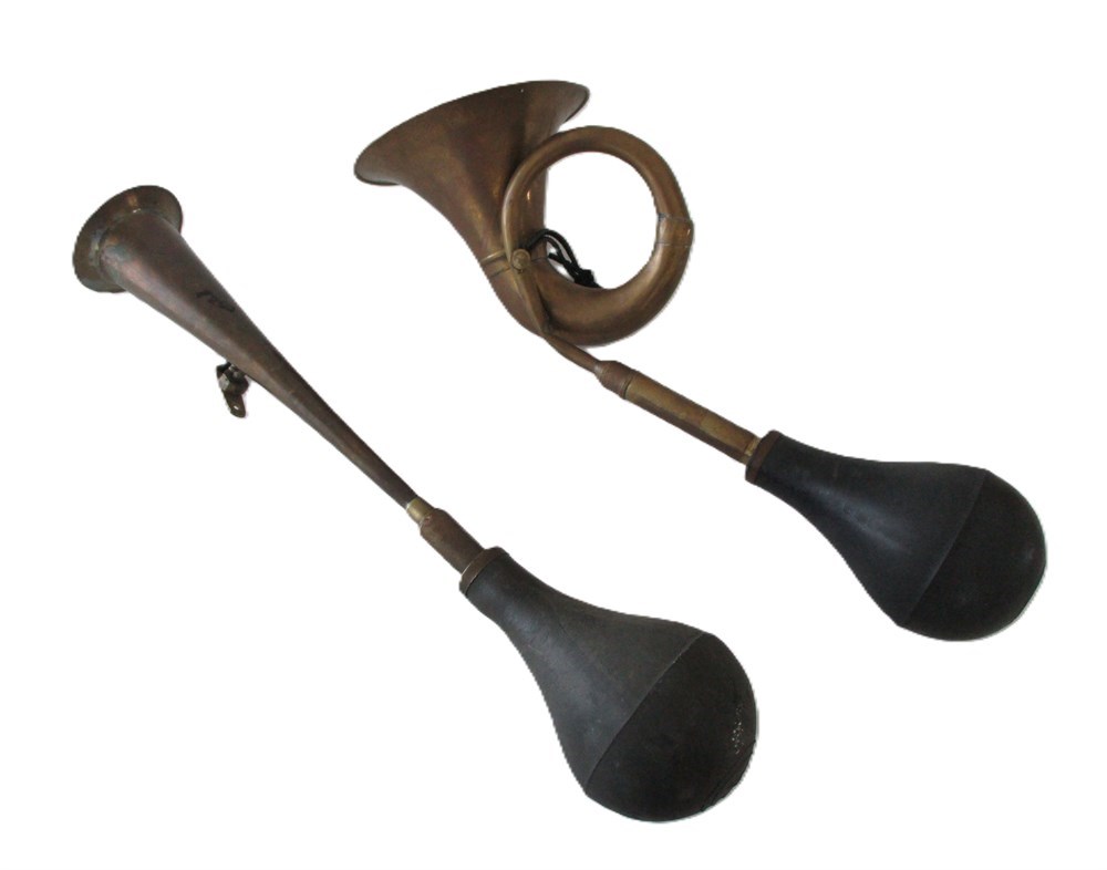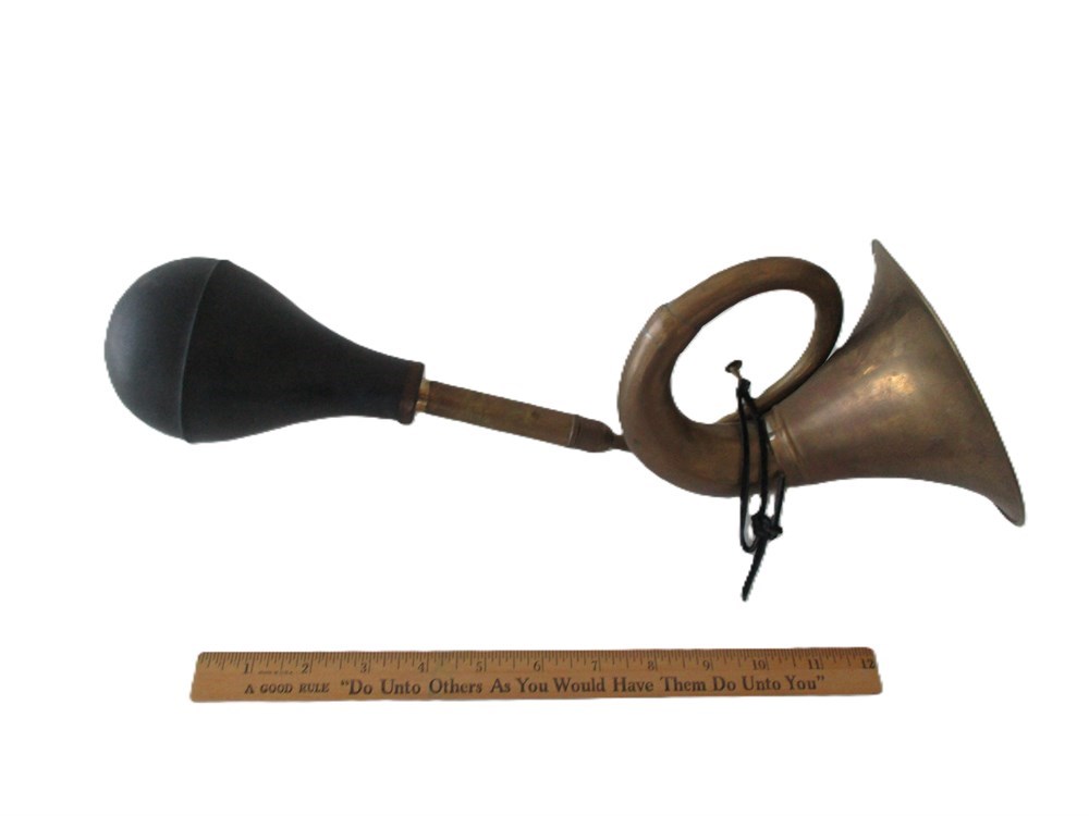 This is a wonderful pair of Vintage/Antique, Brass, Automobile or Bike, Bulb Horns.  One is in the image of a bugle style horn with rubber bulb and the other a trumpet style horn with rubber bulb.  They are in very nice antique condition.  The Rubber bulbs are hard and would need replacing if used other than for decoration.  The Bulbs are easily replaced and found on Amazon or Ebay.  The Bugle style measures approximately 16.5" in length and the trumpet style measures approximately 17" in length.