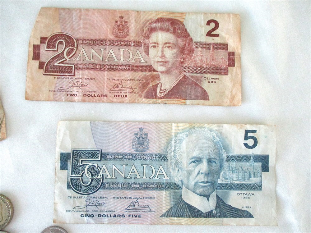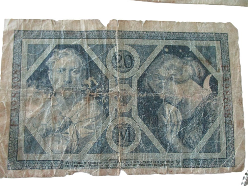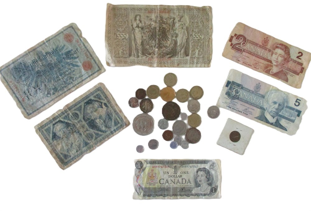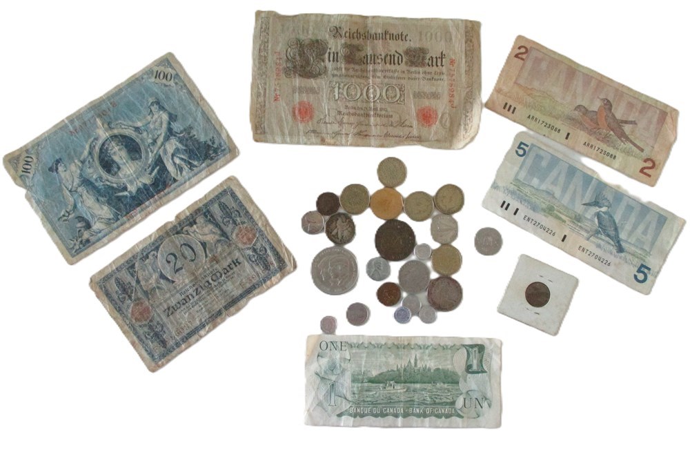 This is a wonderful Antique and Vintage Lot of Foreign Currency & Coin and also U.S. Coins.  The Foreign Bills are German Banknotes, including a 1910 German Empire 1000 Mark Note, a 1908 German Empire 100 Mark Note often recognized by the portrait of Germania and a 20 Mark Reichsbanknote also dating from 1908.  In addition, Canadian Paper Currency.  Coins from Spain, Netherlands, Canada, Bahama Islands, Lady Liberty 1945, 1902 Indian Head Penny, 1981 Princess Diana and Prince Charles Commemorative.  This Lot is in very nice condition wonderful graphics and color with normal age related wear commensurate with use.